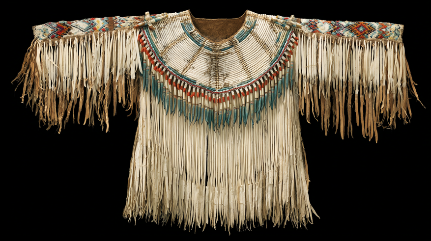 На бахрому удобно вешать всё нужное и важное: мешочки, амулеты, раковины, металлические конусы, кисти, позже, плотные бисерные подвески. Вещь начинает «разговаривать». Для народов Равнин одежда — это не костюм в нашем сценическом смысле, а регалия: краткая биография семьи, роль человека, его связи. С этой точки зрения бахрома, хороший адрес для знаков, потому что она всегда на виду и «оживляет» любой жест.