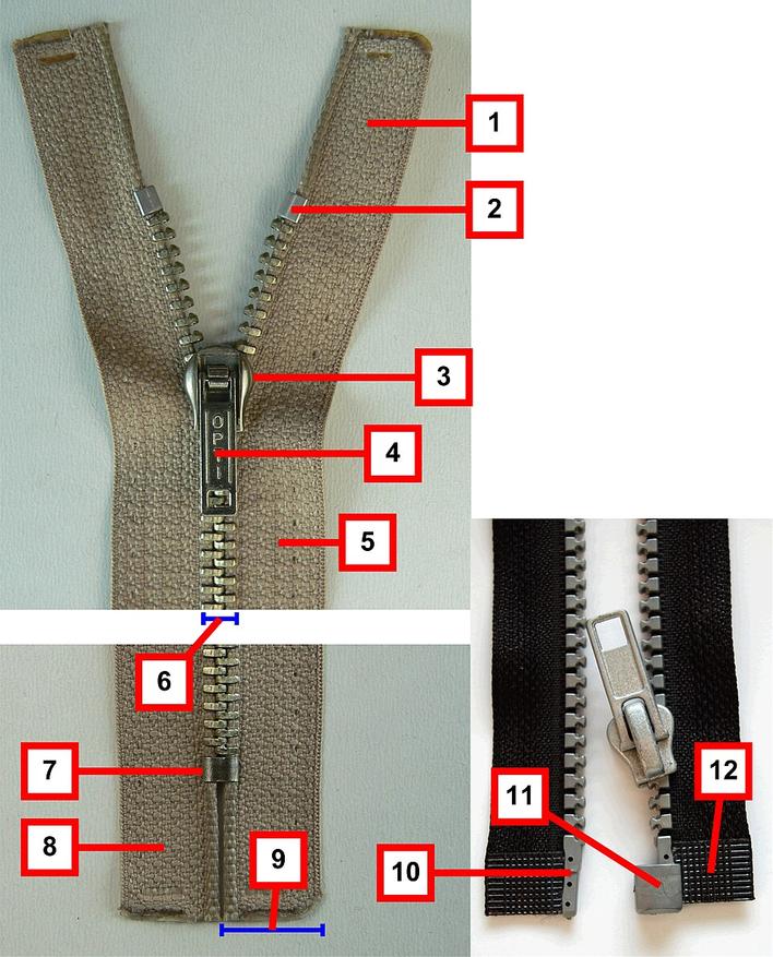 Конструкция молнии включает несколько основных элементов. Основой служит тесьма (5), на которой закреплены ряды зубцов. По краям находятся свободные концы тесьмы (1 и 8). Для ограничения хода механизма используются ограничители (2 и 7). Соединение и разъединение зубцов осуществляется с помощью бегунка — слайдера (3), к которому прикреплён брелок, или пуллер (4), позволяющий перемещать механизм вручную. Также в конструкции выделяют ширину застёжки (6) и ширину тесьмы (9). В разъёмных молниях дополнительно используются штифт (10) и разъёмный ограничитель с гнездом (11), которые обеспечивают соединение двух половин перед застёгиванием. Для усиления конструкции может применяться уплотнительная лента (12).
