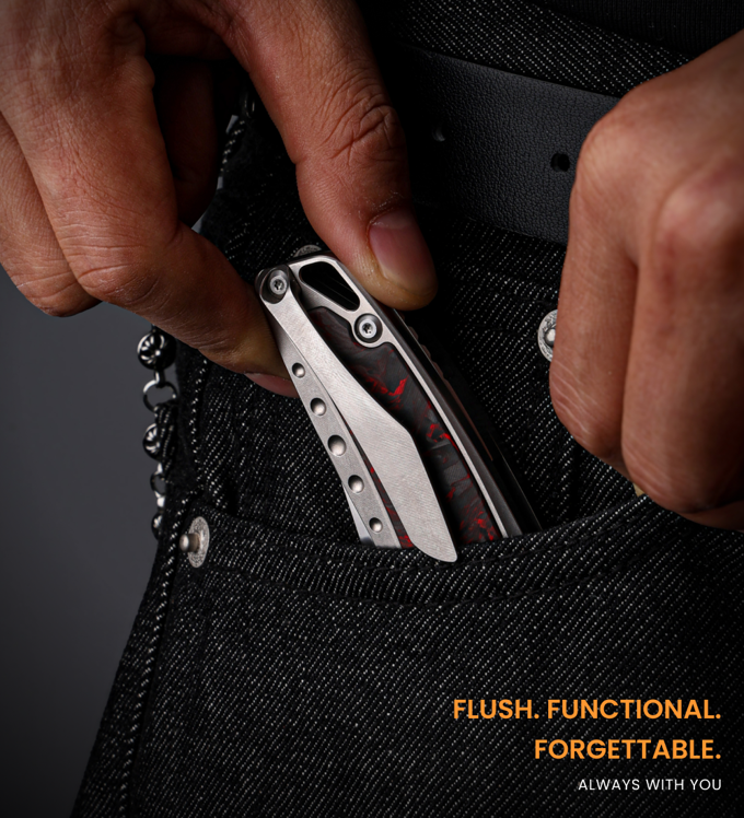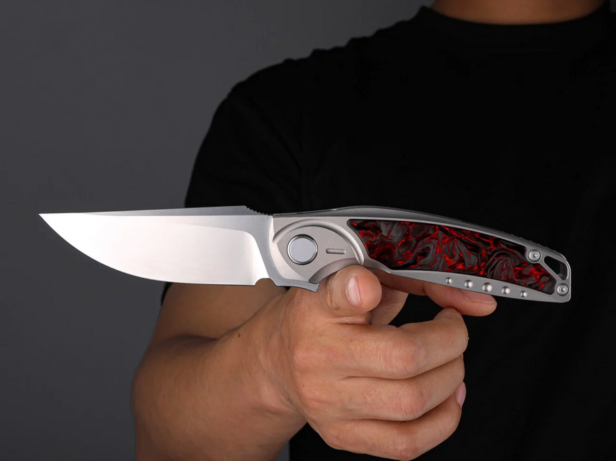 Рукоять изготовлена из титанового сплава Grade 5 (Ti-6Al-4V) — того самого, что используется в аэрокосмической промышленности и медицинских имплантах. При солидном для EDC весе в 159 граммов баланс рукоять-клинок выведен на соотношение 0,618 — что по сути является золотым сечением, примененным к распределению веса. Это значит, что нож естественно вращается в руке, не создавая ощущения тяжести лезвия или рукояти.