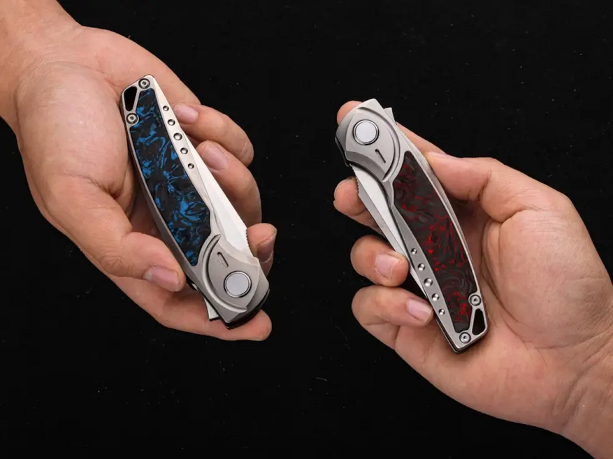 Накладки из карбона благодаря своему рельефу обеспечивают надежный хват даже в перчатках или влажными руками. Каждая накладка уникальна из-за особенностей структуры карбонового волокна. Механизм открывания построен на керамических подшипниках и фосфористо-бронзовых шайбах.