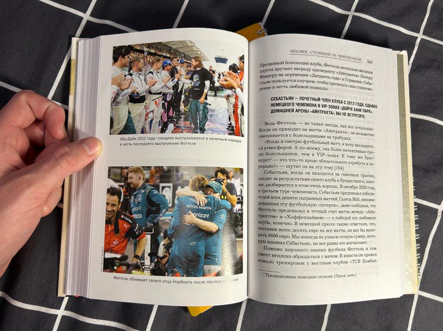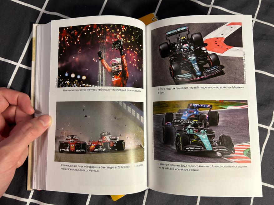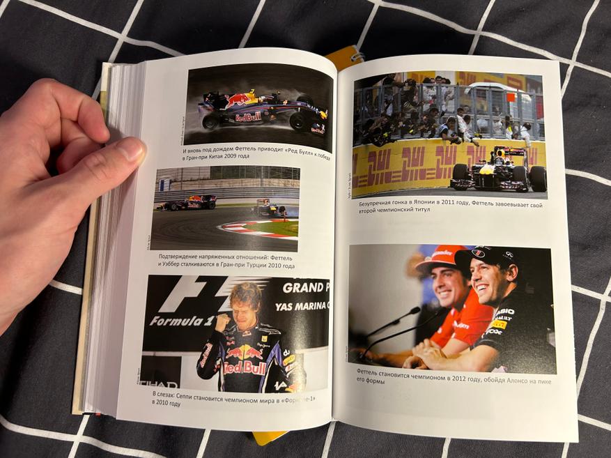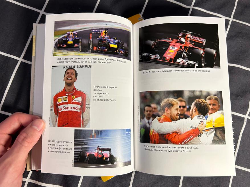 Отдельно порадовали изображения, присутствующие в книге. Всего их 19, и каждое из них относится к одному из важных этапов в карьере Себастьяна Феттеля: это и детское фото с Михаэлем Шумахером, и первый выезд на трассу, и первый завоёванный титул, и как первая, так и последняя победа за «Феррари», и момент прощания с Формулой-1. В этих фотографиях весь жизненный путь немецкого гонщика: от простого мальчика до пилота, добившегося невероятных результатов.