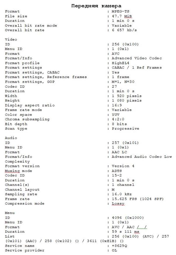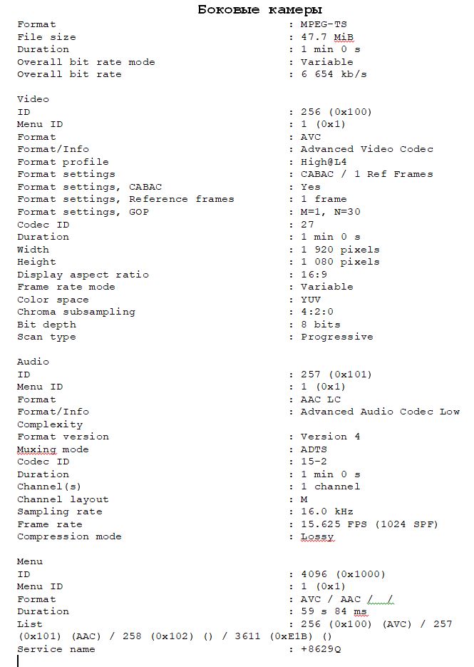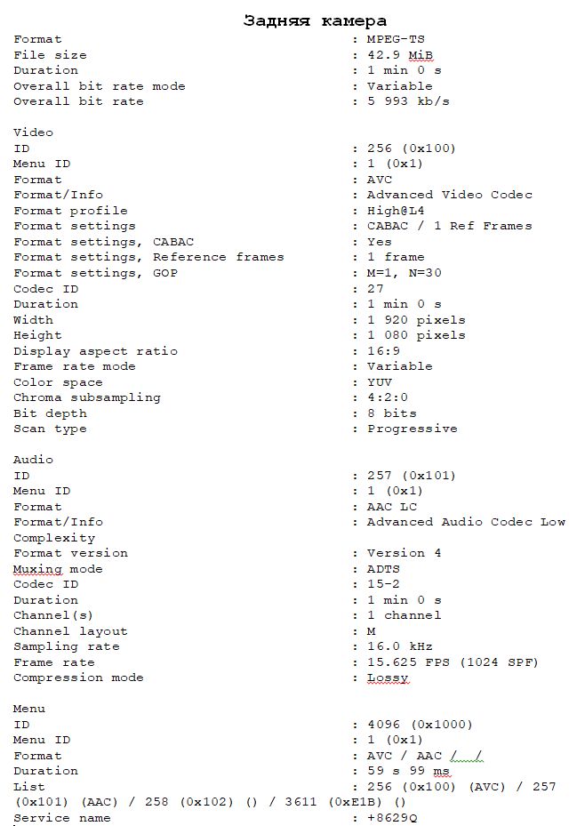 | Разрешение | Когда задняя камера подключена: Full HD (1920x1080) 25 к/с. Когда задняя камера не подключена: 2K (Quad HD) 2560x1440 25 к/с — интерполяция, передняя камера; Full HD (1920x1080) 25 к/с — боковые, салонные камеры; Full HD (1920x1080) 25 к/с — задняя камера |