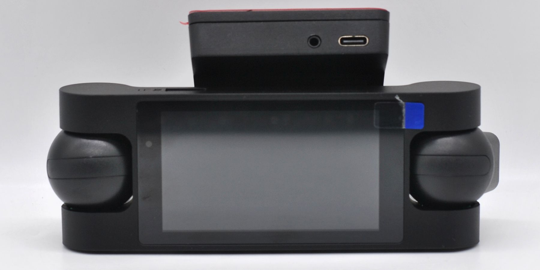 Корпус — вытянутый по горизонтали моноблок, по бокам поворотные камеры, по центру дисплей (фактический размер 67х38 мм), снизу — механические кнопки управления. Объектив передней камеры (диаметр 24 мм) выступает на 15 мм от корпуса.