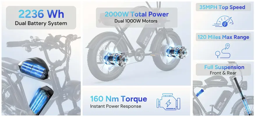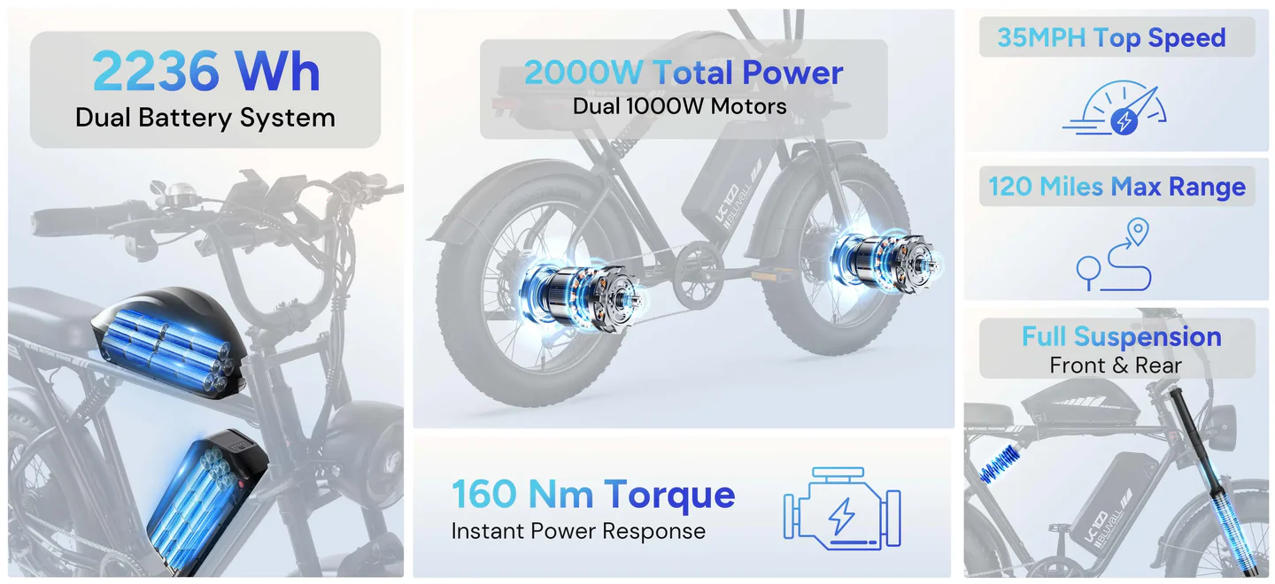 Вся конструкция собрана на раме из углеродистой стали. Транспорт оснащен двумя двигателями мощностью 1000 Вт (160 Н*м крутящего момента и напряжение 52 В), двумя съемными аккумуляторами суммарной мощностью 2236 Вт*ч (всего 43 А*ч), полной подвеской (ход передней подвески — 120 мм). Для снижения мощности можно отдельно включать только передний двигатель. Дополнительный комфорт идет от устойчивых к проколам шин размером 20 x 4,0 дюйма.