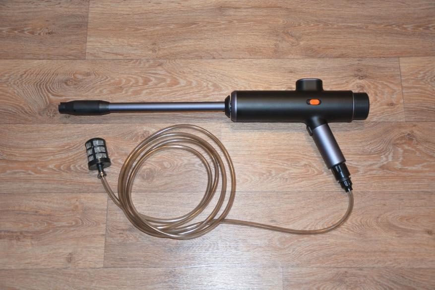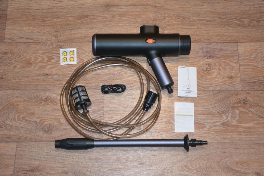 В комплект входят традиционная макулатура, кабель для зарядки аккумулятора USB – Type-C, шланг с быстросъемным коннектором и фильтром, трубка с соплом для формирования струи и фантастического вида аппарат высокого давления.