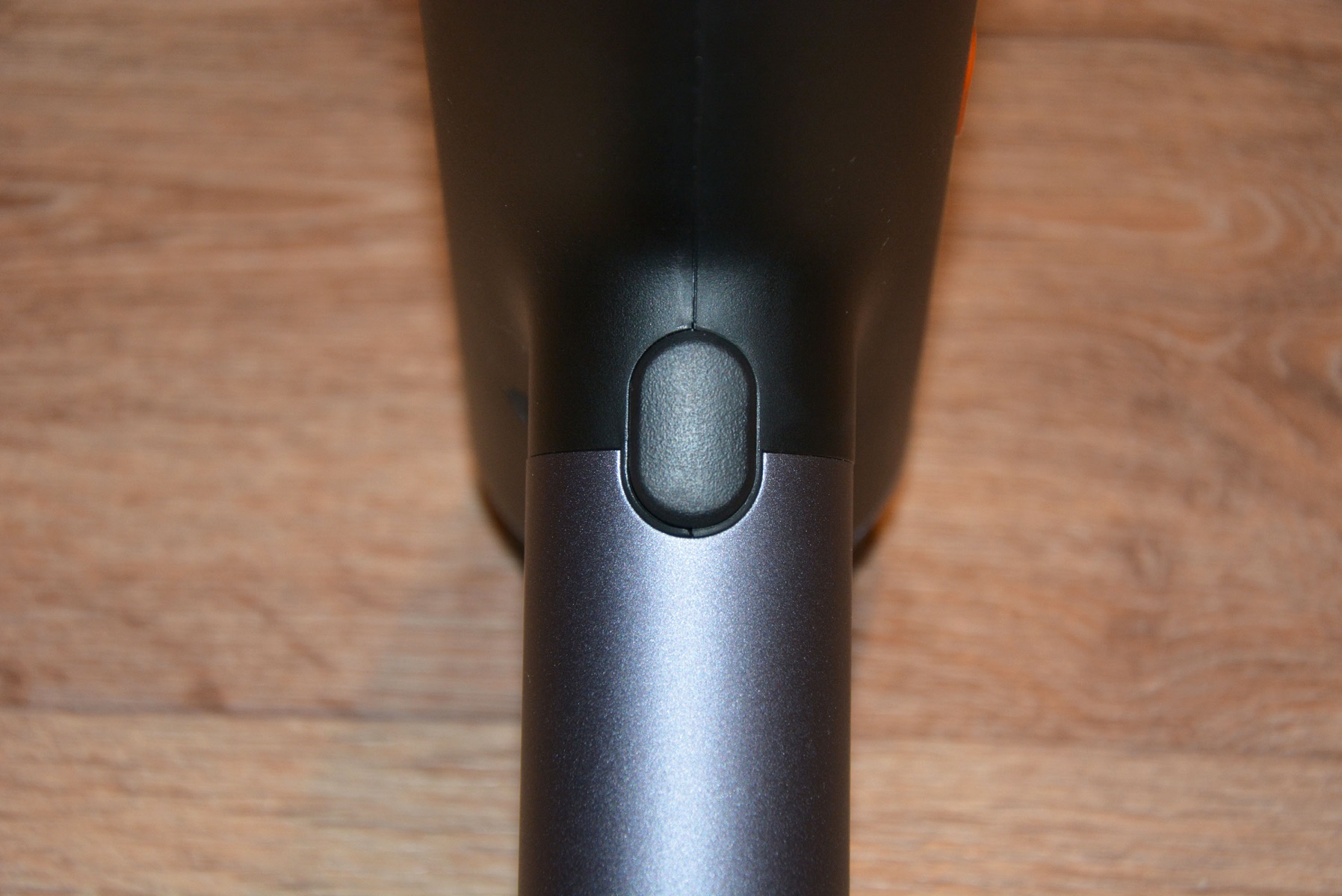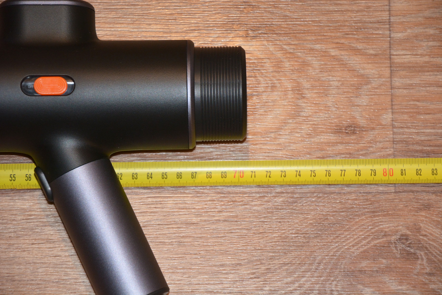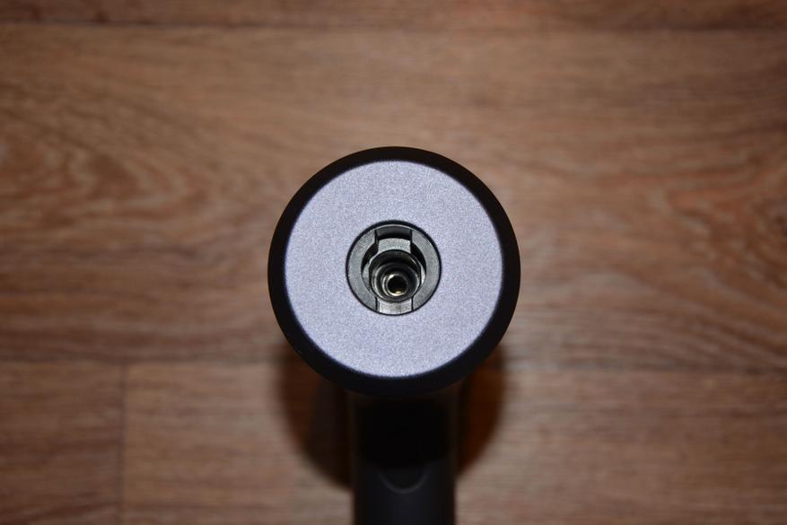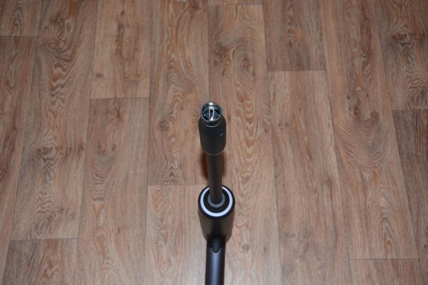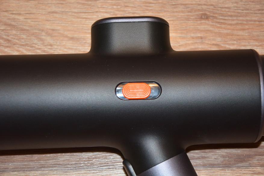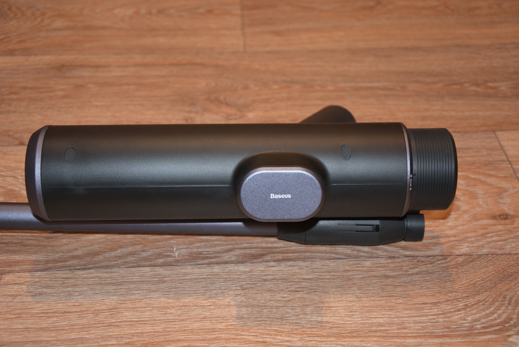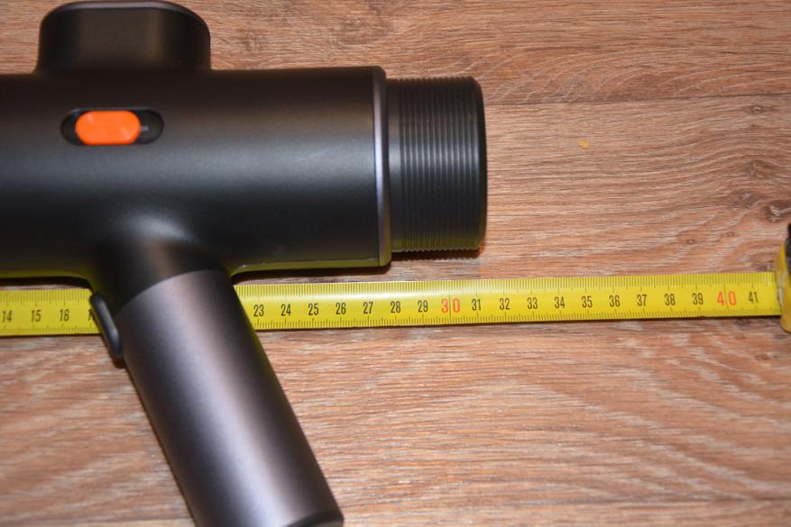 На первый взгляд и не скажешь, что корпус сделан из пластика. Baseus всегда уделяет пристальное внимание внешнему виду своих устройств и, действительно, придраться тут не к чему. Пластик, но без запаха, облоя, нестыковок и т.д. Все очень аккуратно. Из основных элементов можно выделить переключатель питания, кнопку пуска, штуцер на конце рукоятки и аккумулятор совершенно необычного вида и расположения с тыльной стороны корпуса. Длина аппарата 31 см.