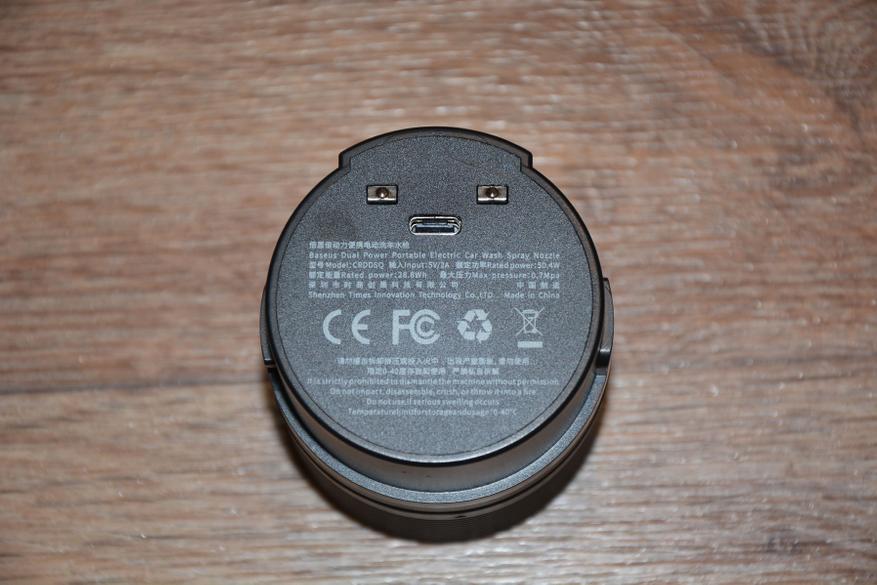 Для зарядки аккумулятора его нужно снять так, как разъем Type-C находится рядом с контактами, что исключает его засорение или попадание влаги. Заодно можно по надписям на корпусе аккумулятора узнать характеристики аккумулятора и артикул мойки - CRDDSQ-01 и рабочий температурный диапазон 0-40 градусов Цельсия, что справедливо и для аккумулятора, и для мойки в целом.