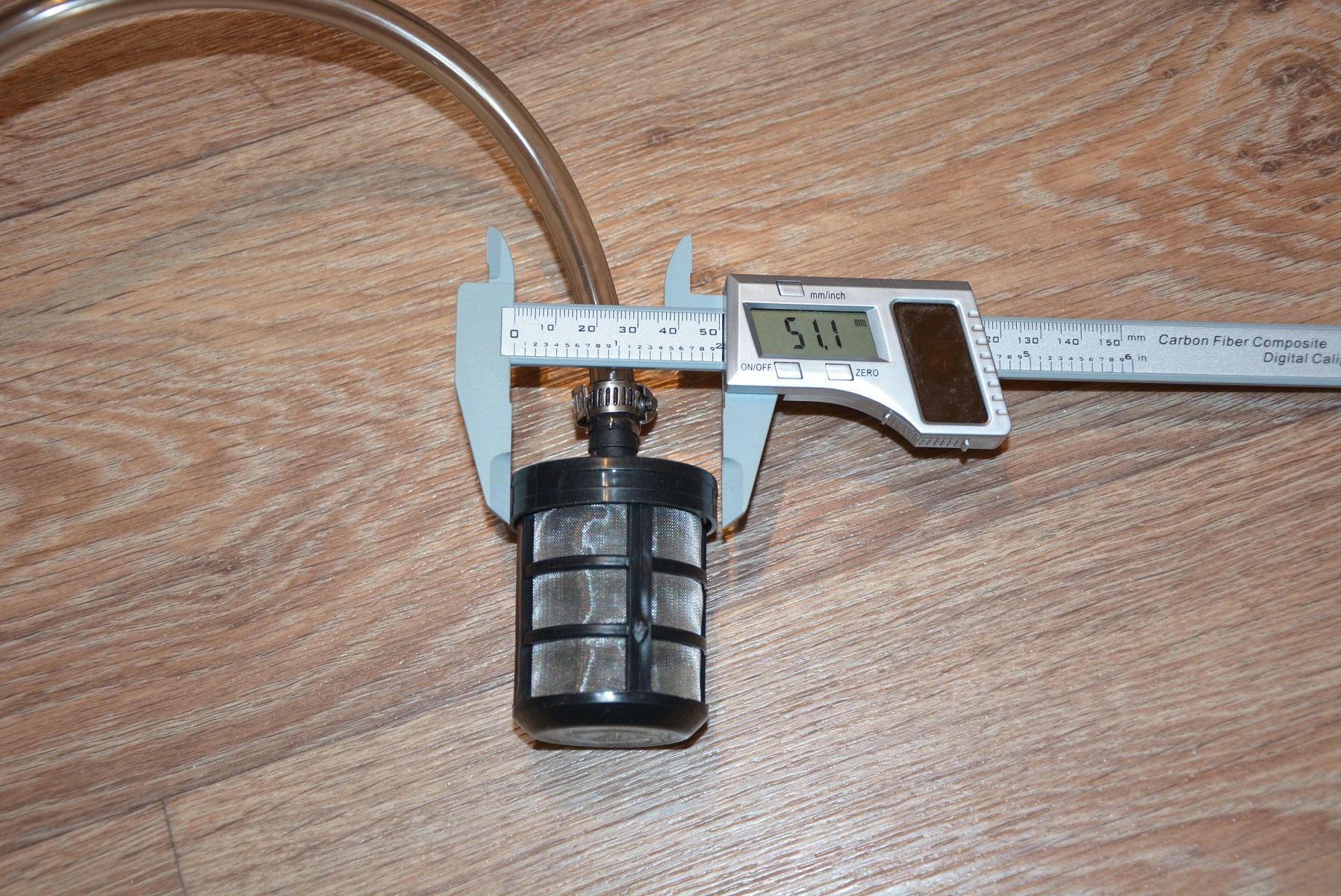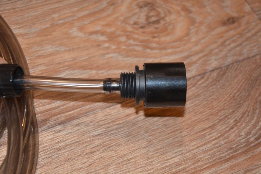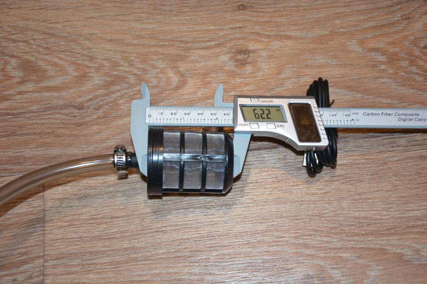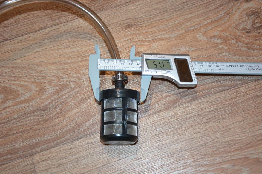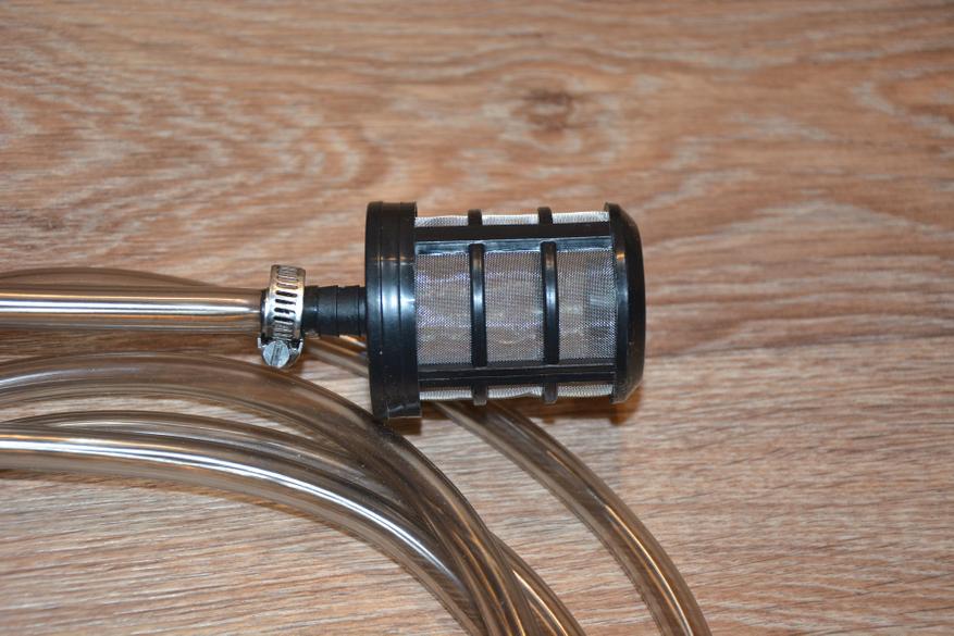Сетчатый фильтр от мусора крепится к силиконовому шлангу диаметром 10 мм и длиной 3,5 метра незатейливым способом с помощью хомута. Решение не самое изящное, но простое и, если длины шланга вдруг не хватит, его легко можно заменить или удлинить. Диаметр фильтра 50 мм, т.е. емкость для воды нужно использовать с широкой горловиной.