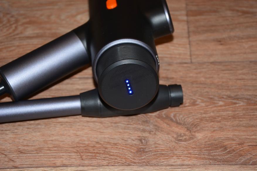 Емкости аккумулятора хватает на полчаса работы, что является хорошим показателем для аппарата мощностью 50 Вт. На странице товара указана производительность 72 литра в час, т.е. на одной зарядке мойка использует 32 литра воды, а о состоянии ее аккумулятора пользователя информирует светодиодный индикатор, где каждый светодиод обозначает 25 % емкости. Индикатор начинает светиться только после нажатия на кнопку пуска помпы и гаснет через несколько секунд после ее отключения.