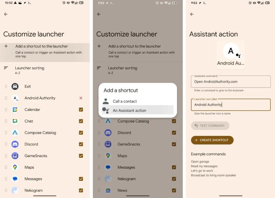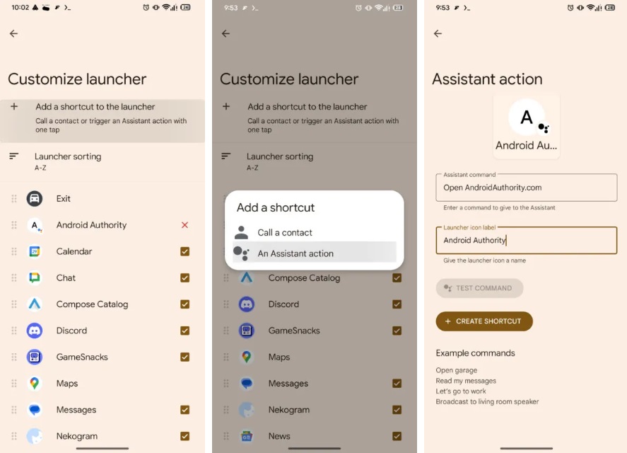 В текущей версии Android Authority функции «Google Ассистент» доступны через «Настройка панели запуска» > «Добавить ярлык на панель запуска» > «Действие Ассистента». Где также можно задать название ярлыка и протестировать команду для проверки ее корректности.