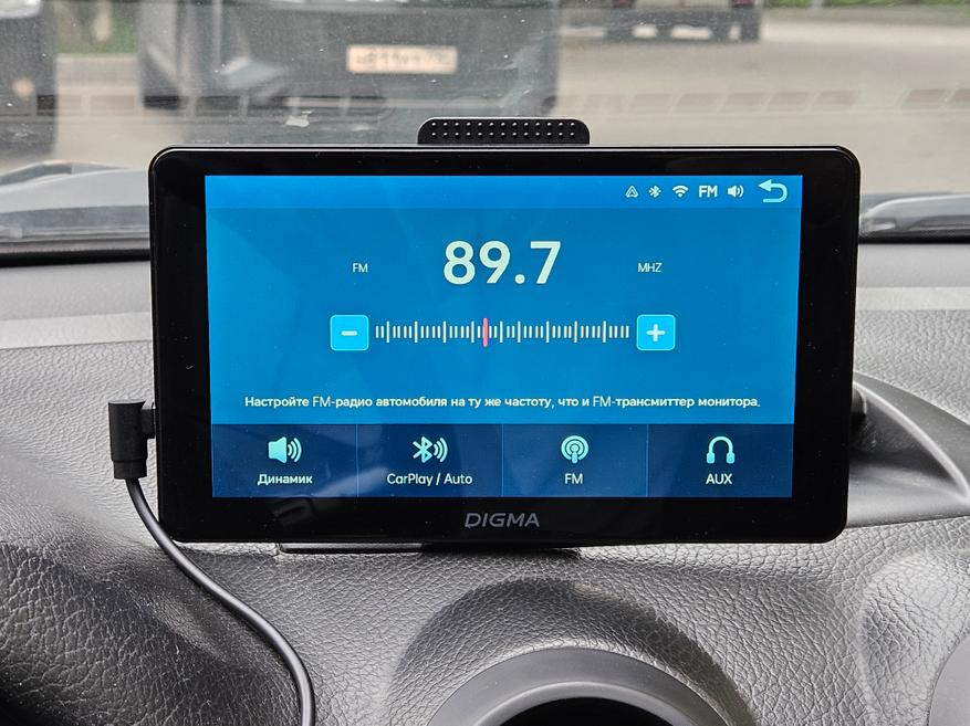 Ну и киллер фича — возможность создания своей собственной радиостанции. Выбираем в настройках частоту, на которой будем «вещать». Теперь ловим её на магнитоле в авто. И вуаля — магия случилась. Теперь музыка с моего телефона Samsung Galaxy S23 уходит на Digma Smart Play 600 по Bluetooth и далее попадает на колонки автомобиля через FM радио. По-моему это гениально.