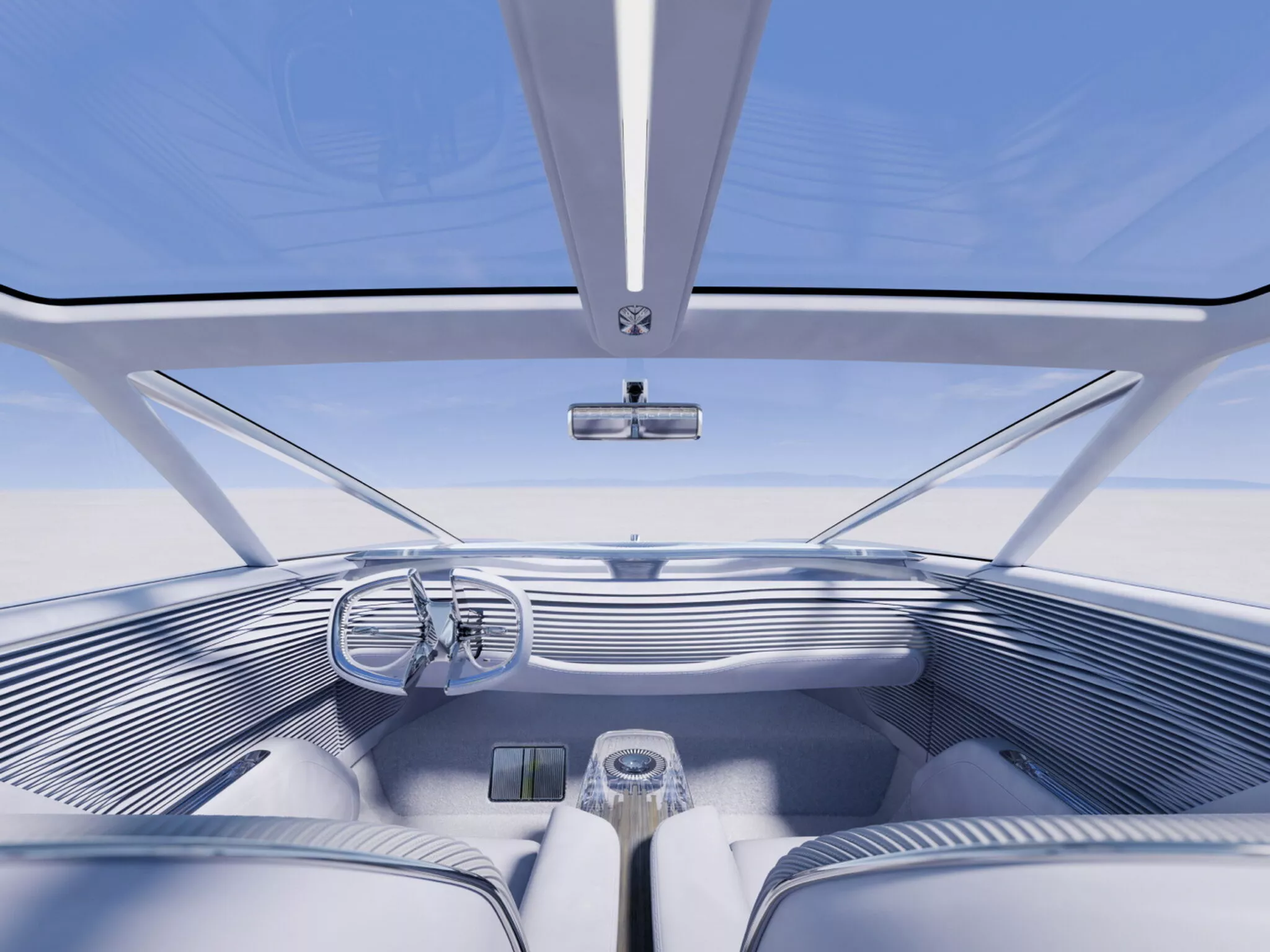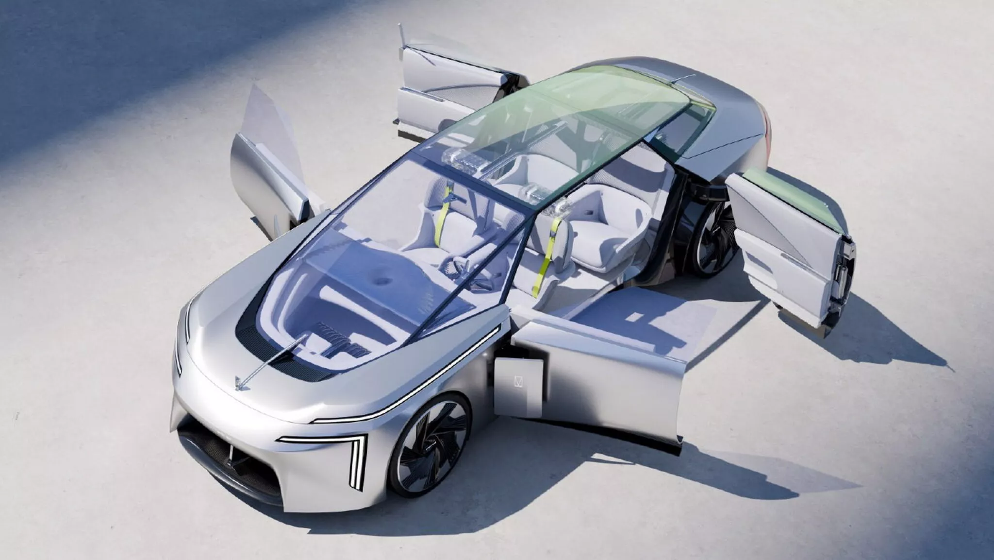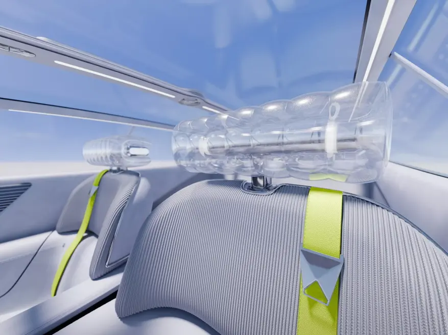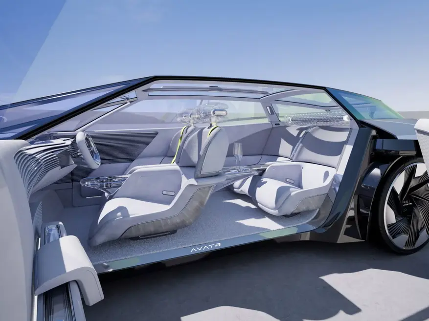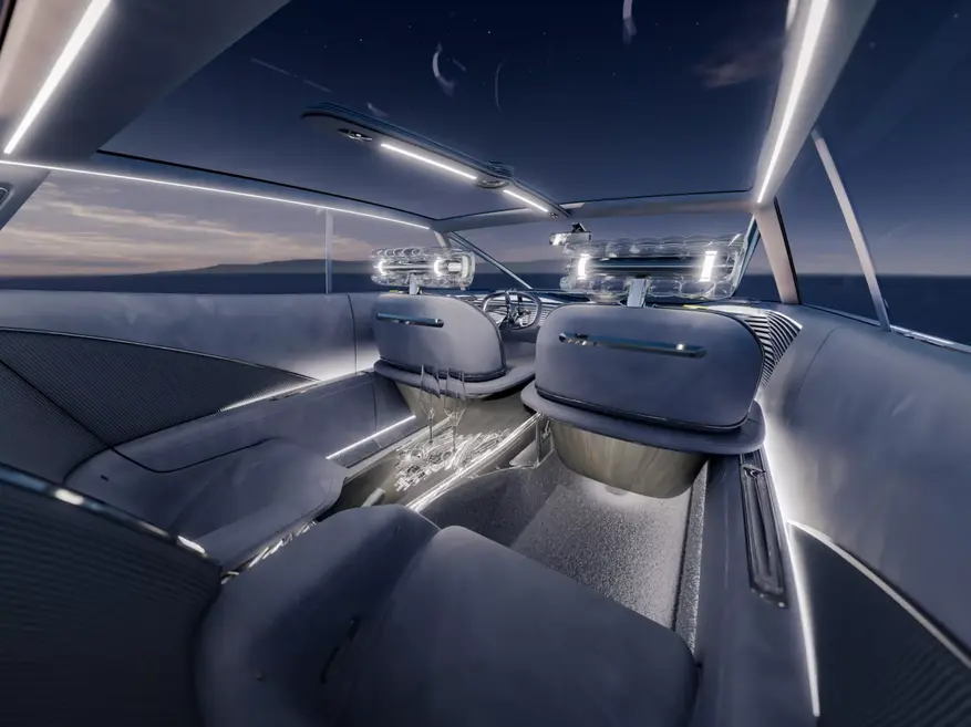 Автомобиль оснащен четырехместным салоном с большими дверями без стоек. В интерьере установлены прозрачные дисплеи, динамическая подсветка и подголовники специальной конструкции. Центральный элемент приборной панели содержит искусственный интеллект для взаимодействия с пассажирами. Управление осуществляется через круглый элемент на центральной консоли, поддерживающий сенсорное и жестовое управление.