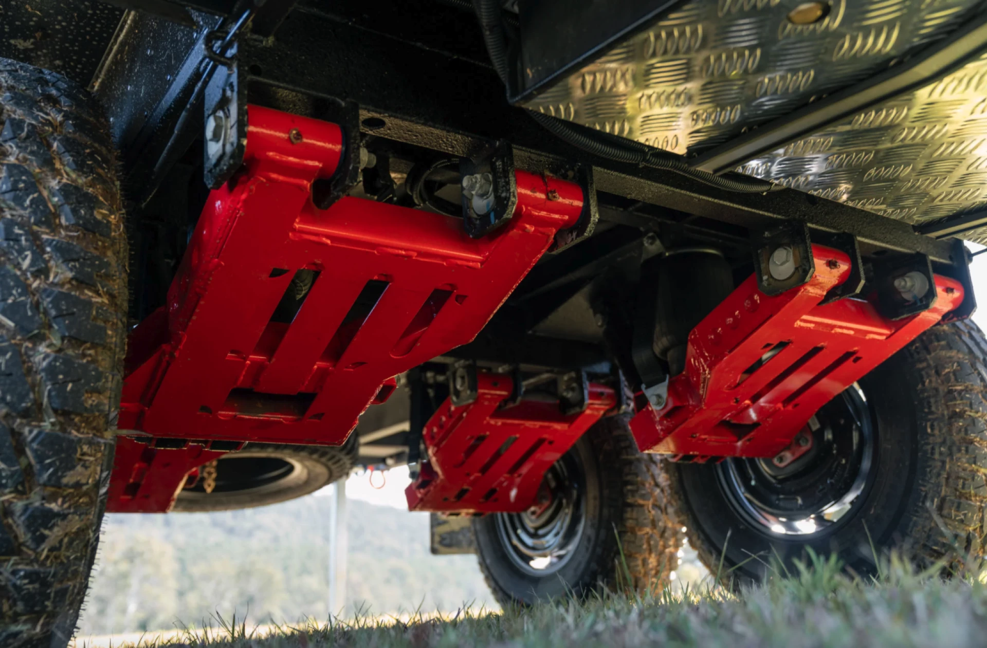 Конструкция кемпера включает оцинкованную стальную раму и алюминиевый кузов. Подвеска тандемная независимая с пружинами и газовыми амортизаторами, дополненная пневматическими элементами для регулировки нагрузки на фаркоп. Дорожный просвет составляет 500 мм, кемпер оснащён внедорожными шинами 265/75 R16.