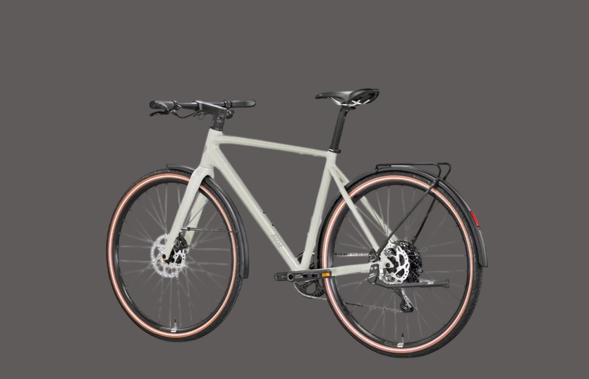 Велосипед катится на дисках Newmen Performance 25, 29″ (29 дюймов), обутых в покрышки Continental Ride City wire reflex. В комплектацию входят: тормоза Shimano BL-RS600, встроенная фара LightSkin на руле, задний свет Trelock COB Line LS 453, багажник, и брызговики Hebie ALUMEE.