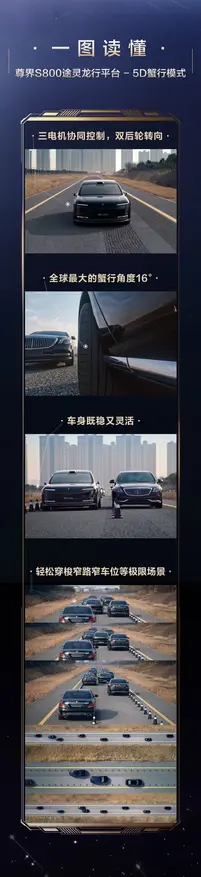 Согласно сообщениям, режим 5D crab riding в автомобиле Hongmeng Zhixing Zunjie S800 поддерживает совместное управление тремя двигателями, двойное рулевое управление задними колесами и самый большой в мире угол поворота в режиме краба — 16 градусов, что позволяет преодолевать экстремальные условия, такие как узкие дороги и парковочные места.