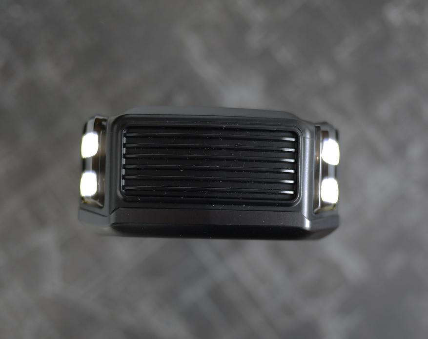 на верхнем торце расположен фонарик и хоть он и имеет четыре светодиода, светит слабовато. Понятно что присветить хватит, но хотелось бы помощнее.