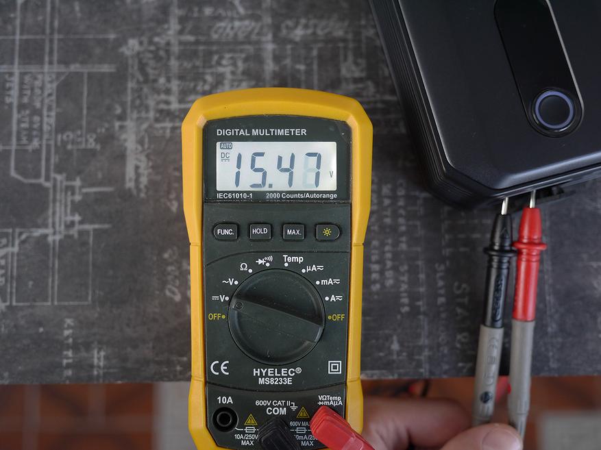 На выходе при заряде 75% напряжение на клеммах 15,47В