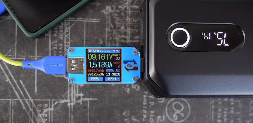 Сверху устройства расположился небольшой дисплей и клавиша включения. Дисплей отображает остаточный заряд и если подключен потребитель к USB то отображается мощность отдачи с порта. Если сравнивать с тестером, то показания правильные.