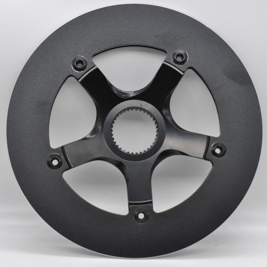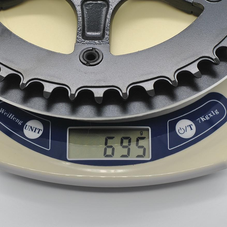 Начнем с ведущей звезды. Она крепится бонками на литой алюминиевый паук и даже защитное кольцо выполнено из алюминия — мощно. Установка на вал каретки на шлицы.