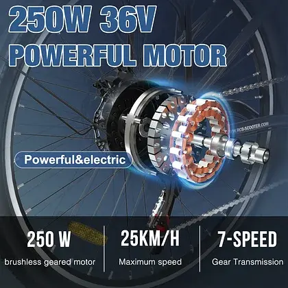 Этот электровелосипед оснащен двигателем мощностью 250 Вт, что обеспечивает достаточную мощность для ежедневных поездок. Его максимальная скорость составляет около 25 км в час, что делает его подходящим для поездок на работу и кемпинга. Электровелосипед оснащен сверхпрочными шинами 26″ * 2,35″, которые устойчивы к износу и проколам. На велосипеде можно свободно ездить в горах, в городе и на природе.