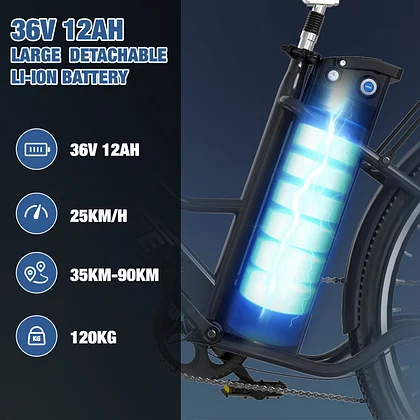 Модель оснащена встроенной съемной литиевой батареей емкостью 36 В и емкостью 12 А*ч. Запас хода велосипеда составляет от 35 км в режиме в чисто электрическом режиме до 90 км в режиме PAS. Фактический запас хода может варьироваться в зависимости от веса велосипедиста и дорожных условий. Существует два способа зарядки велосипеда — вы можете либо зарядить его напрямую, либо извлечь аккумулятор и зарядить его отдельно.