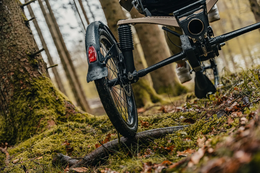 Алюминиевая рама оснащена телескопическим механизмом, также регулируется наклон сидения для обеспечения комфортной посадки. Максимальная нагрузка на раму до 140 кг, а подвеска оси по типу автомобильной имеет ход 70 мм. Покрышки колес Schwalbe Marathon Plus, а тормоза комбинированные: механические дисковые спереди и гидравлические на заднюю ось.