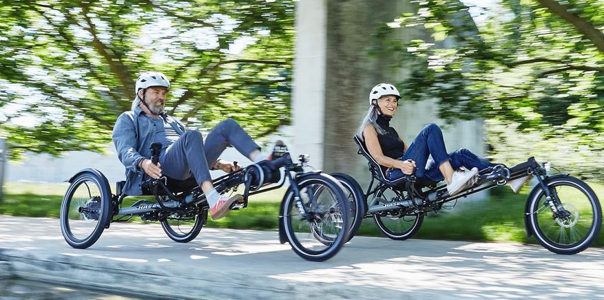 Не только детские велосипеды используют устойчивую схему с тремя колесами, такая конструкция распространена для дорожных моделей с низкой посадкой полулежа. Компания Hase Bikes из Германии на свое 30-ти летие представила модель необычного трайка с электроприводом и колесами 20″. Велосипед Kettwiesel One оснащается центральным электромотором Shimano Steps 6100, подвеской MacPherson задней оси и рамой, которая подстраивается под рост пользователя (от 1,1 до 2 метров). Управление классическим рулем либо рычагами.