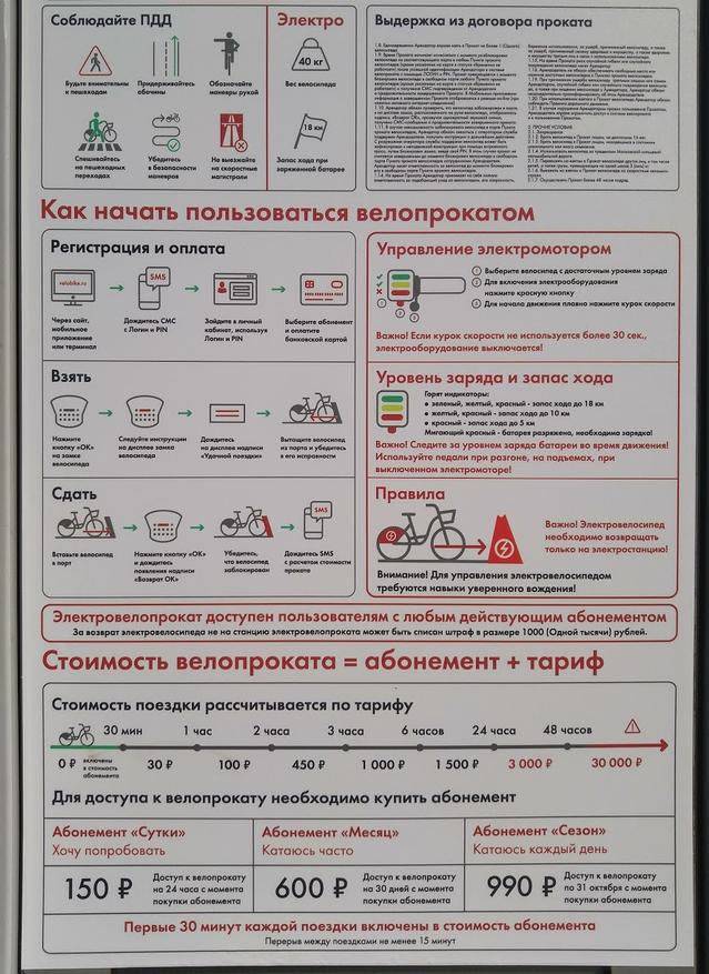 Всего таких прокатов по Москве 6 (в других источниках говорят, что 5), а самих велосипедов — 150. Немного, но проект все-таки пилотный. Если вы зарегистрированы на обычный прокат велосипедов (у меня, например, к нему еще и тройка привязана, очень удобно), то с тем же самом логином можно брать электробайк. Условия — те же.