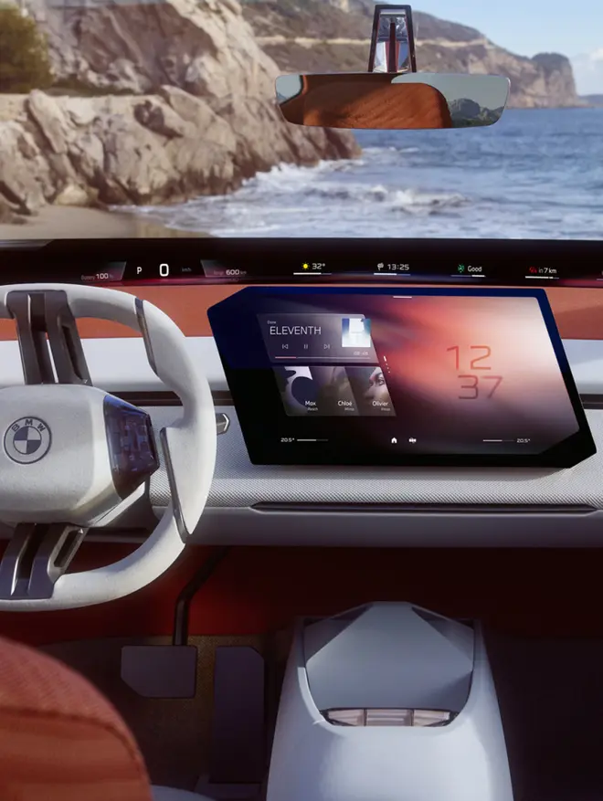 В интерьере основной элемент — панорамный проекционный дисплей iDrive Vision с проекцией до 40 дюймов на лобовое стекло. Центральная консоль оснащена изогнутым сенсорным экраном диагональю 14,9 дюйма, ориентированным на водителя. Панель поддерживает управление касаниями и жестами и дополнена рядом физических кнопок. В серийной версии для китайского рынка планируется интеграция искусственного интеллекта для адаптации к локальным цифровым сервисам.