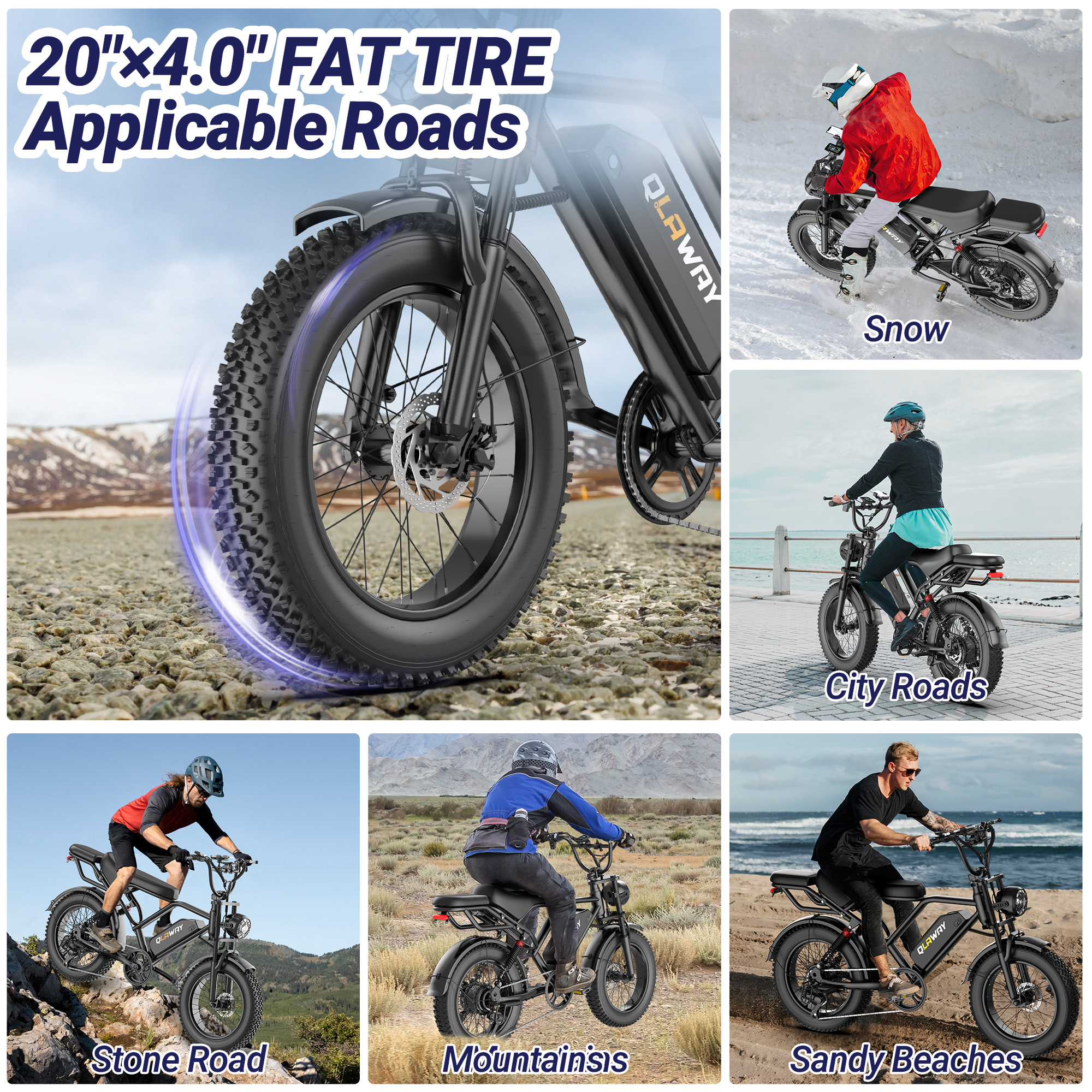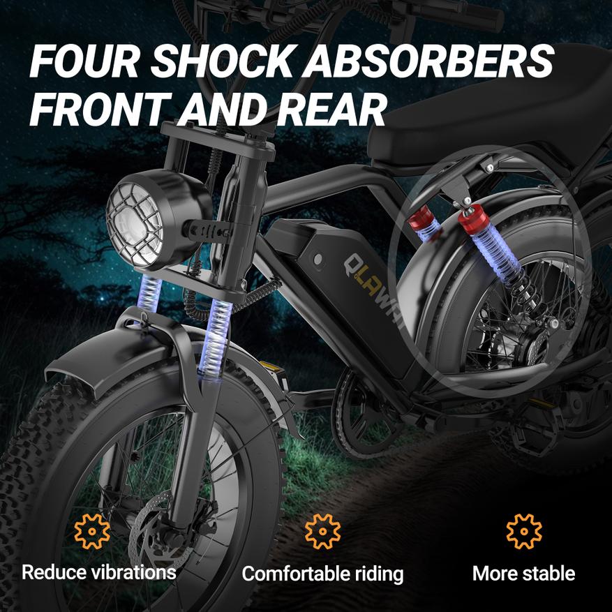 Электровелосипед Qlaway BK20 отличается рамой из нержавеющей стали и комплектным «дополнительным» задним сиденьем. Оба сидения выполнены из кожи. Транспортное средство идет с полной подвеской на толстых шинах.