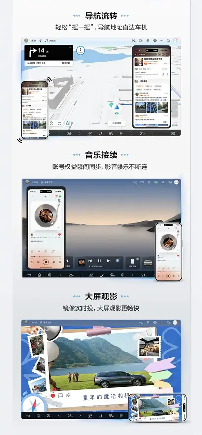 Функция потока навигации позволяет быстро передавать адреса с телефона на автомобильный компьютер с помощью простого встряхивания устройства. Технология продолжения музыки обеспечивает синхронизацию учетных записей пользователя, что позволяет непрерывно пользоваться аудио- и видеоразвлечениями. Функция просмотра на большом экране реализует проекцию изображения с мобильного устройства на дисплей автомобиля в реальном времени.
