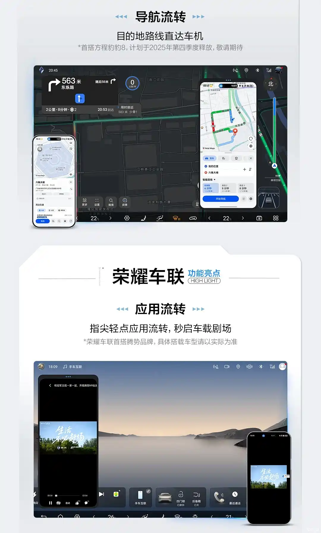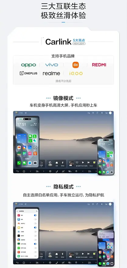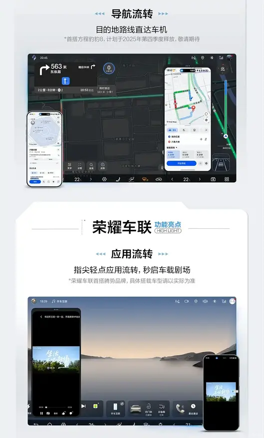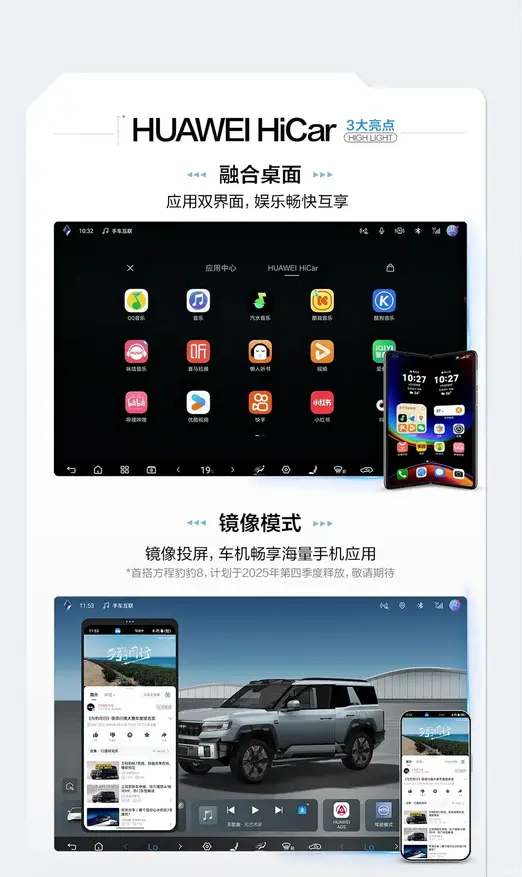 BYD также подтвердил совместимость с фирменными технологиями подключения от ведущих производителей смартфонов. В частности, система Huawei HiCar поддерживает интегрированный рабочий стол, режим зеркалирования и поток навигации. Первым автомобилем с полной поддержкой этой технологии станет Formula Leopard 8, выпуск которого запланирован на четвертый квартал 2025 года. Система Honor Car Connect, поддерживающая поток приложений, впервые будет реализована в автомобилях бренда Denza, входящего в группу BYD.