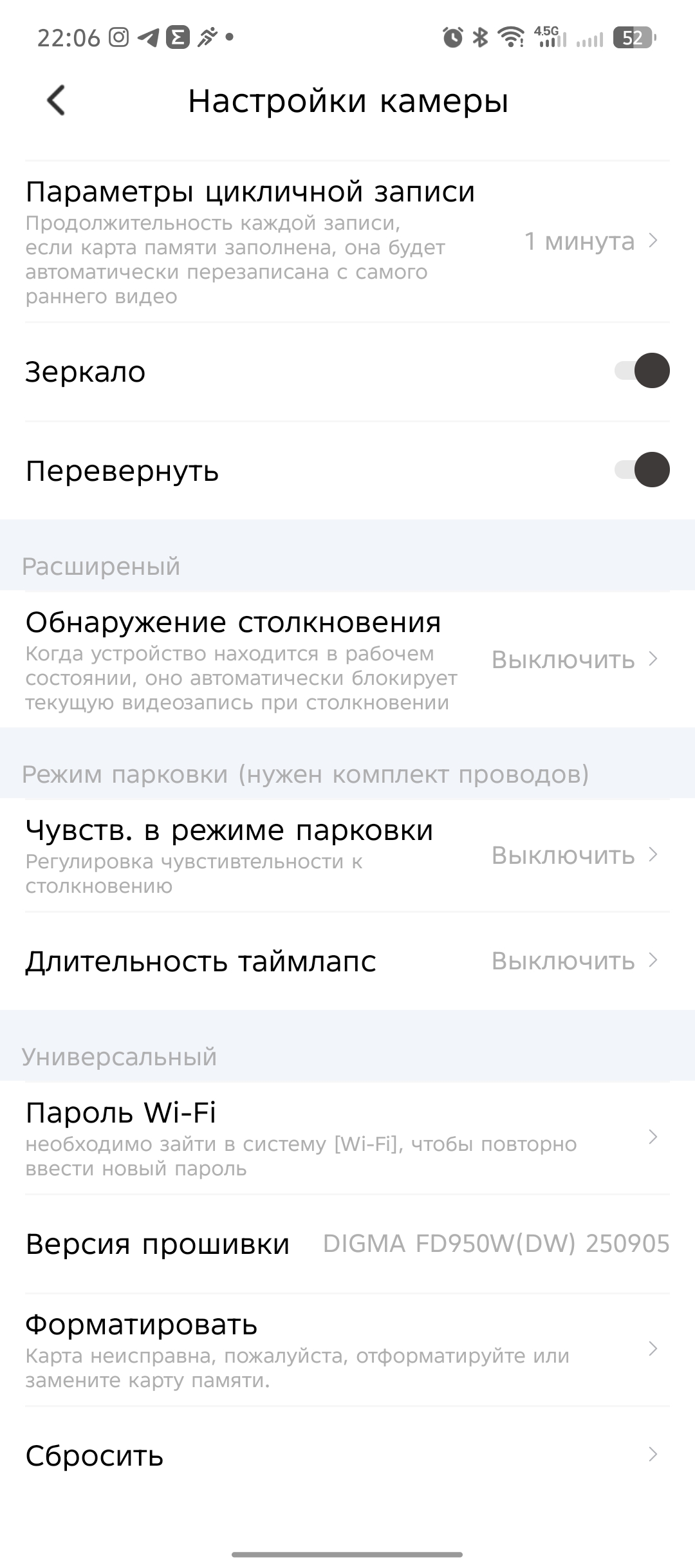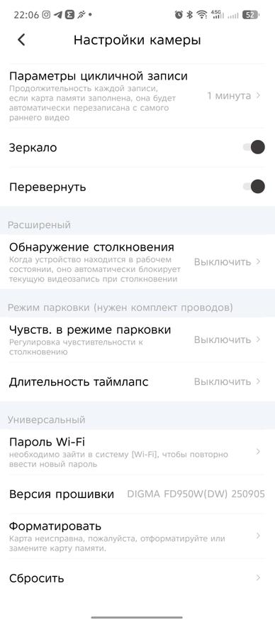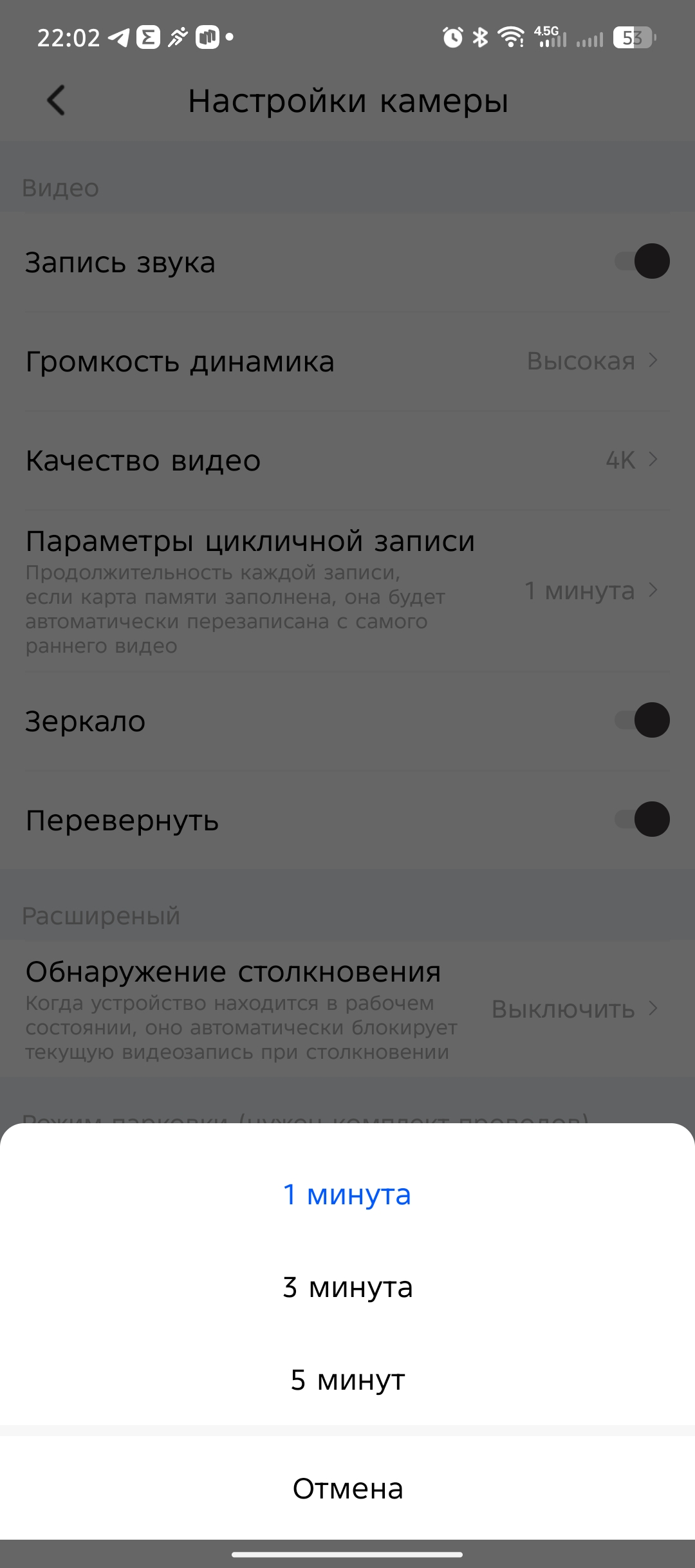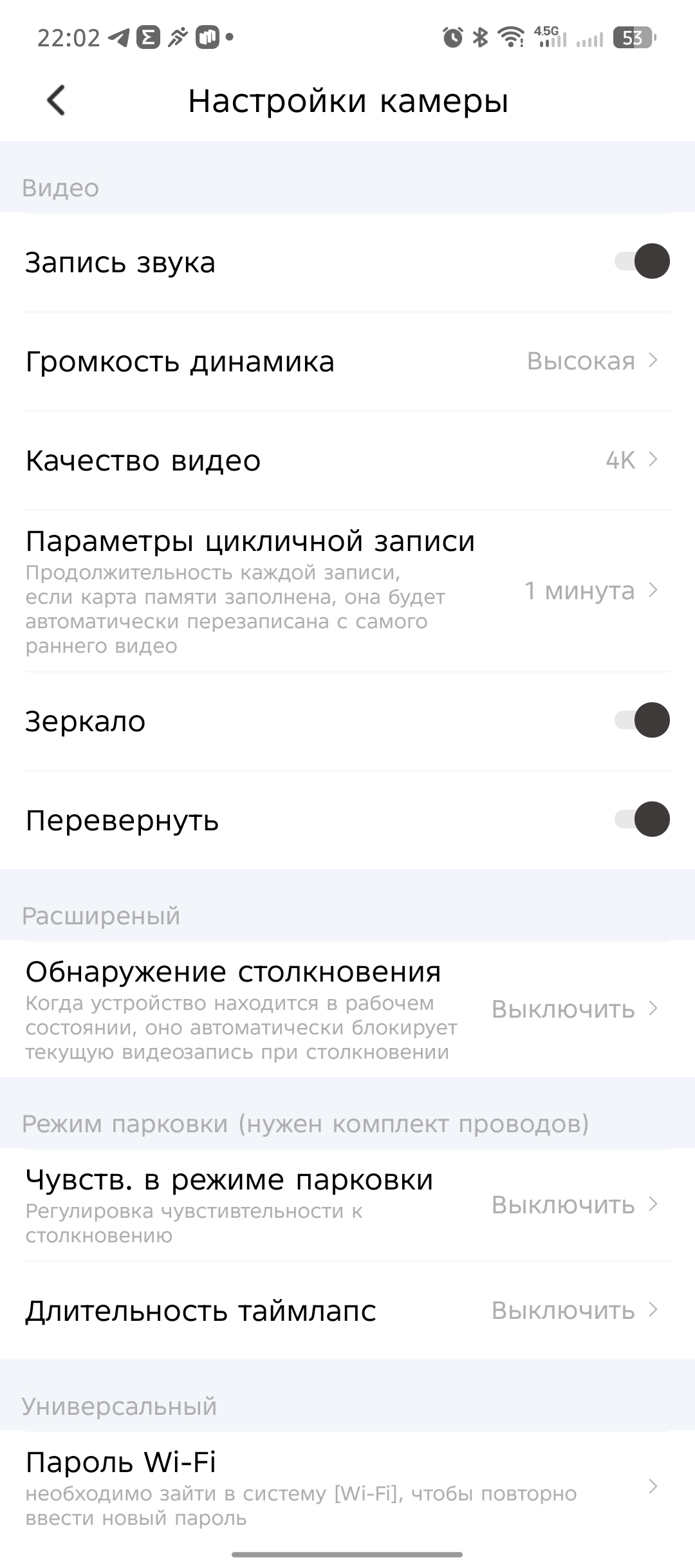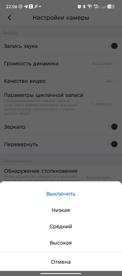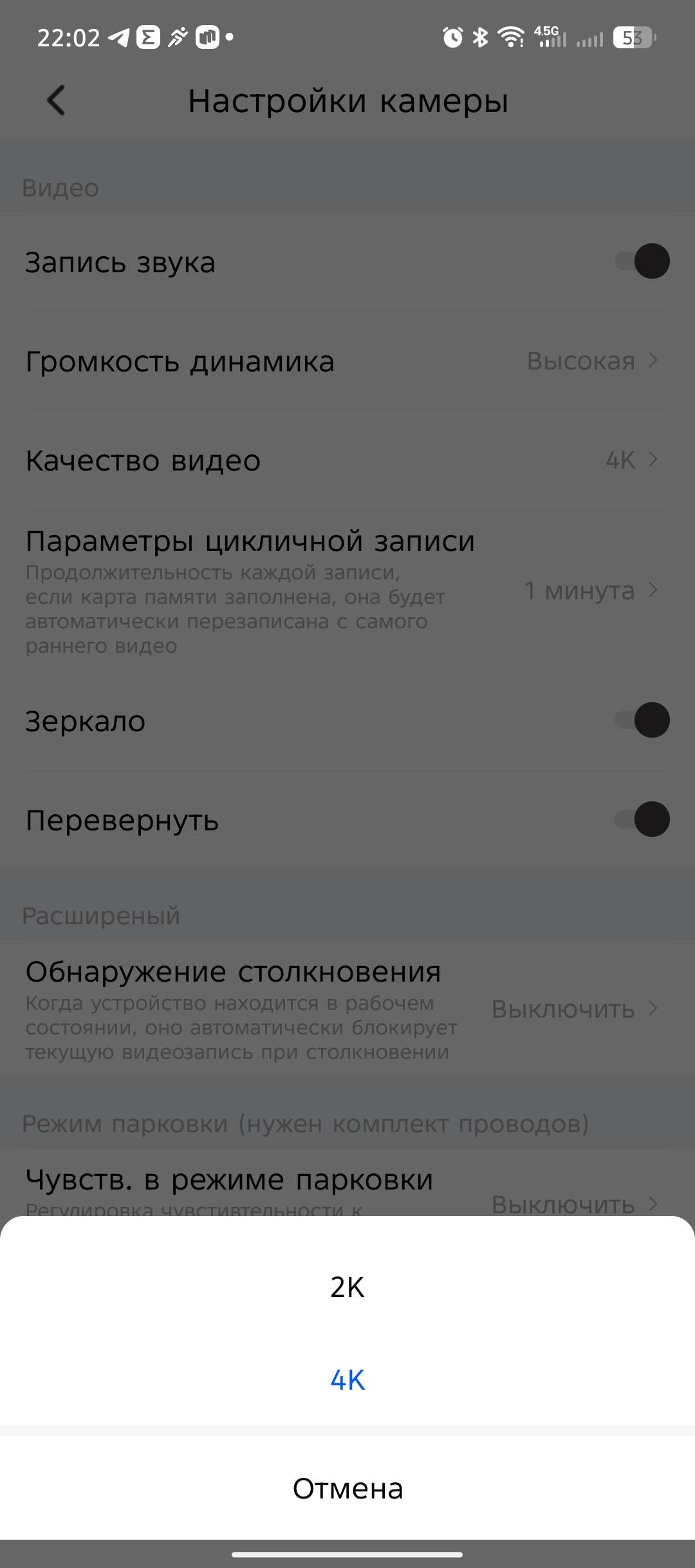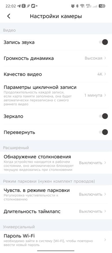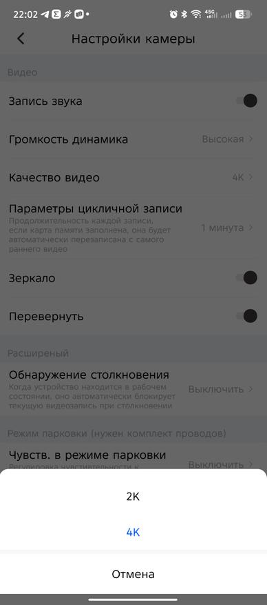 В настройках приложения есть ряд интересных параметров, такие как настройка громкости динамика, качество видеосъемки (2К или 4К), цикличная запись (1, 3, 5 минут). Также предусмотрен раздел с парковочным ассистентом (при покупке комплекта прямого подключения к АКБ) и с расширенными настройками, где можно включить G-сенсор (датчик удара) и настроить его чувствительность (низкая, средняя, высокая).