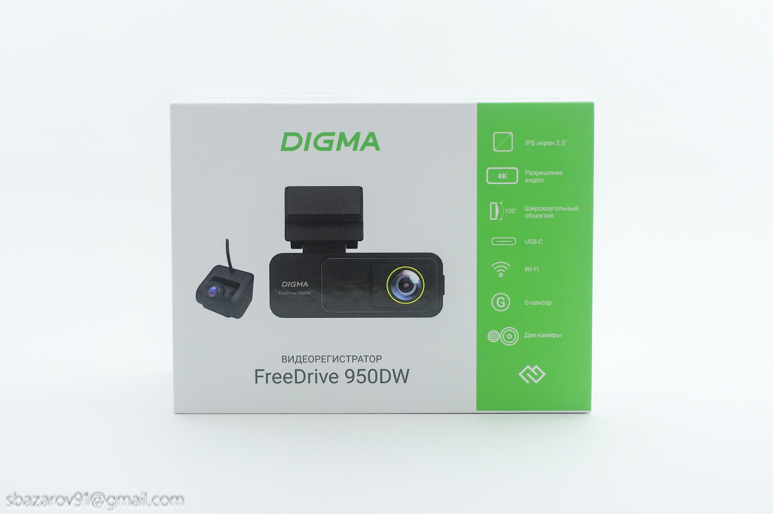 Видеорегистратор DIGMA FreeDrive 950DW поставляется в картонной коробке белого цвета. Также на лицевой стороне можно увидеть вертикальную зеленую полосу с особенностями устройства. Из преимуществ: большой 2,5'' дисплей в компактном корпусе, поддержка съемки видео в 4К разрешении и две камеры в комплекте.