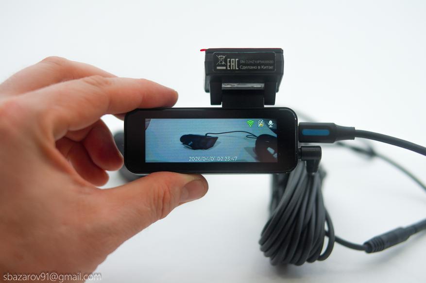После подачи питания на видеорегистратор и его дальнейшего включения с помощью боковой кнопки можно переключаться между выводом изображения с передней или задней камер. Вывести одновременно изображение с двух камер не получится, да и неудобно это будет.