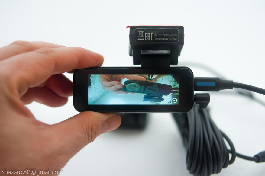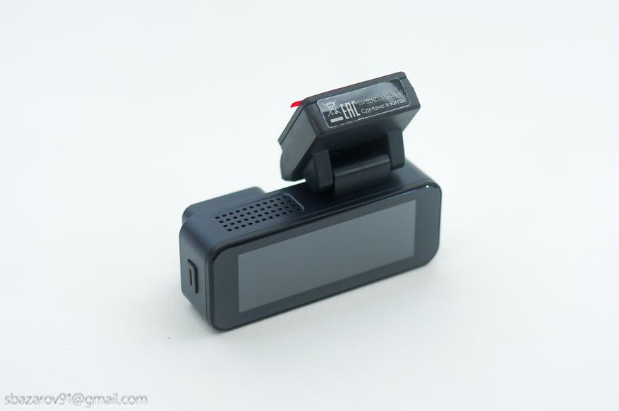 Сама довольно миниатюрная и позволяет снимать видео с разрешением 2 Мп (1080p@30к/с). Угол съемки камеры не разглашается, но эмпирическим путем выявлено до 3 полос. А вот угол наклона довольно большой и позволяет детально выставить камеры на любом стекле.