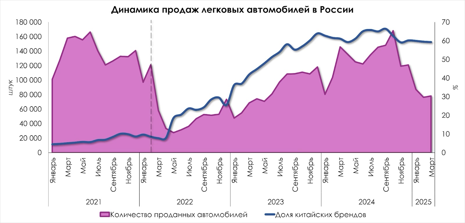 Параллельно с этим росла доля китайских марок. На фоне высоких цен и дефицита привычных брендов люди стали всё чаще смотреть в сторону Китая. И дело не в любви к геополитике — просто других вариантов стало меньше.