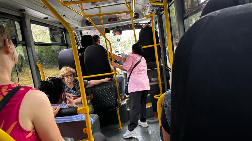 Внутри всё предельно просто: скромные сиденья, проход и кондиционер, который чаще служит декоративным элементом, чем реально спасает от жары. В разгар знойного дня водитель спасает своих пассажиров, просто распахнув двери и включая «естественную вентиляцию». Ветер, конечно, приятно освежает, но стоит взглянуть на открытую дверь — и сразу начинает биться сильнее сердце. Поскольку, данная ситуация, конечно, вызывает определённые вопросы о безопасности. Однако серьёзные инциденты с пассажирами по этой причине встречаются редко.