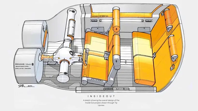 Концепт INSIDEOUT имеет капсульную форму с прозрачными и полупрозрачными панелями, позволяющими пассажирам ощущать связь с природой во время поездки. Ключевой особенностью автомобиля стала способность трансформироваться в два режима использования. В режиме «Пикник» кузов полностью открывается, а пол опускается до уровня земли, превращая транспортное средство в открытую площадку для отдыха. «Приватный режим» обеспечивает частичную изоляцию при сохранении визуальной связи с окружающим миром.
