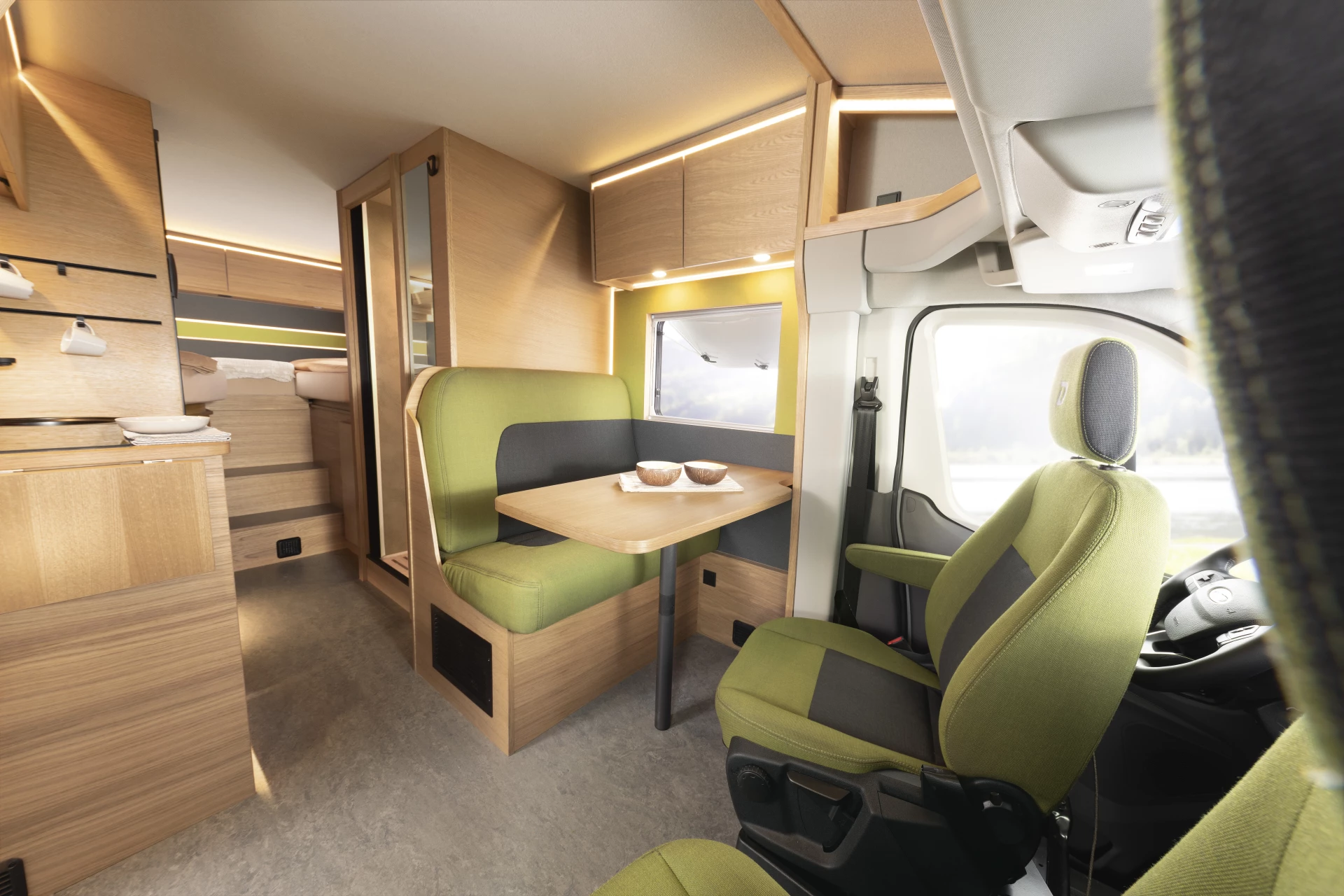 Пол в автодоме покрыт натуральным линолеумом, состоящим из джутовой ткани, льняного масла, пробковой муки и натуральных смол. Обивка изготовлена из обработанной овечьей шерсти, обеспечивающей тепло, комфорт и устойчивость к пятнам и огню.