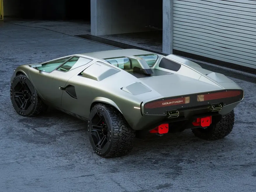 Среди раллийных элементов — открытые буксировочные проушины красного цвета на переднем и заднем бамперах, защитная пластина днища, каркас безопасности в салоне. Задняя часть получила светодиодную полосу во всю ширину с надписью Countach вместо оригинальных трапециевидных фонарей.