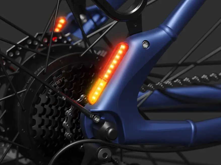 Светодиодный дисплей центра управления является съемным, и без него велосипед невозможно включить. В комплект освещения входят фара, встроенная в раму, и задний фонарь, который служит стоп-сигналом и включает указатели поворота. На задней стойке также есть задний фонарь.