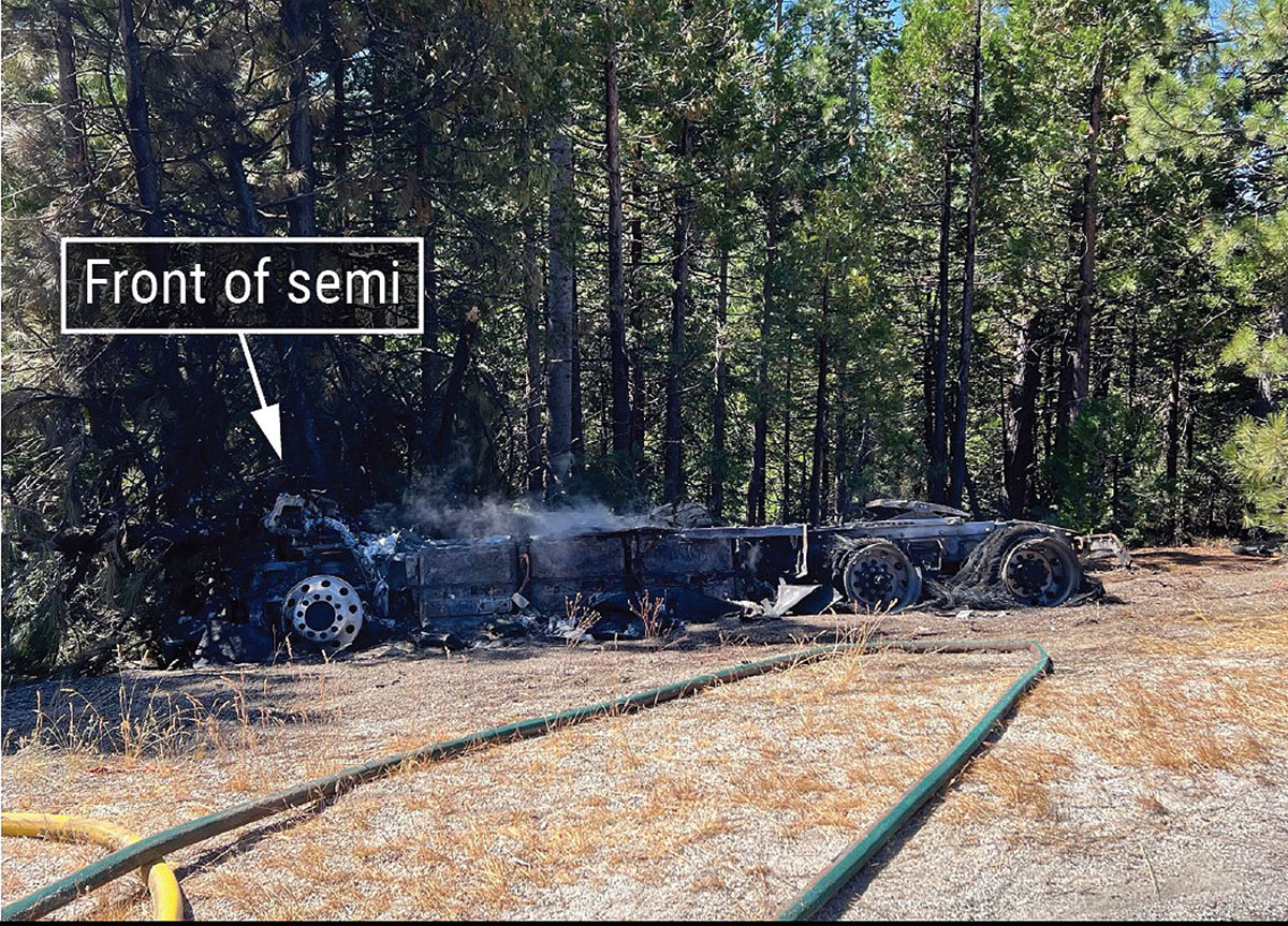 19 августа Tesla Semi съехал с трассы, врезался в дерево и скатился в лес. После съезда с дороги литий-ионная батарея грузовика начала гореть, но водитель Tesla смог покинуть кабину без травм. Спасателям пришлось тушить электромобиль в течение нескольких часов, так как элементы аккумулятора могли повторно воспламениться. Кроме того, им было необходимо задействовать пожарный самолет для того, чтобы распылять огнезащитное вещество по всей территории и гарантировать, что огонь не выйдет за пределы зоны аварии.