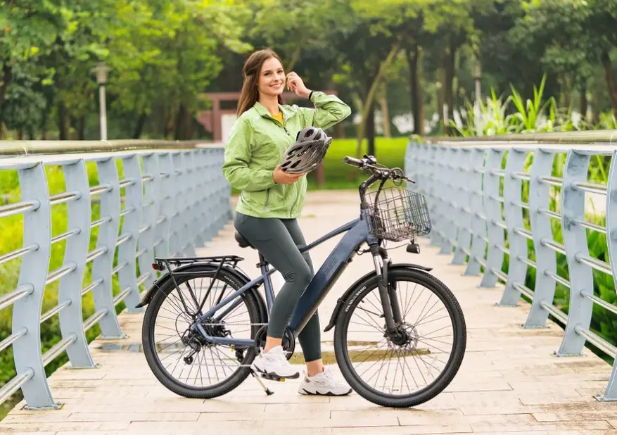 Освещение представлено фарой спереди и отражателем под фарой и задним светильником с функцией стоп-сигнала. Покрышки размером 26 x 1,95 дюйма обеспечивают езду по велосипедным дорожкам на асфальте. Передняя вилка амортизирует удары, а кожаное седло обеспечивает комфорт.