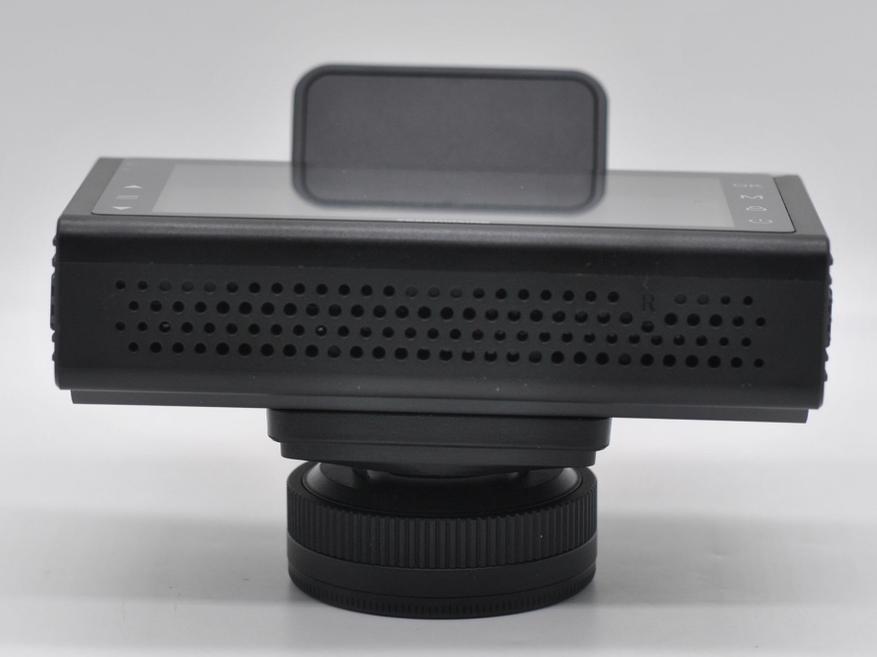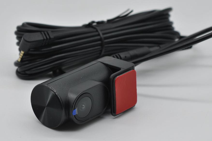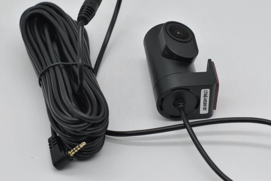 Задняя камера (можно использовать и как салонную) с поворотным основанием, пишет в 1280x720p. Водозащита не заявлена, я вешал внутрь салона. Длины кабеля хватает для скрытой установки.