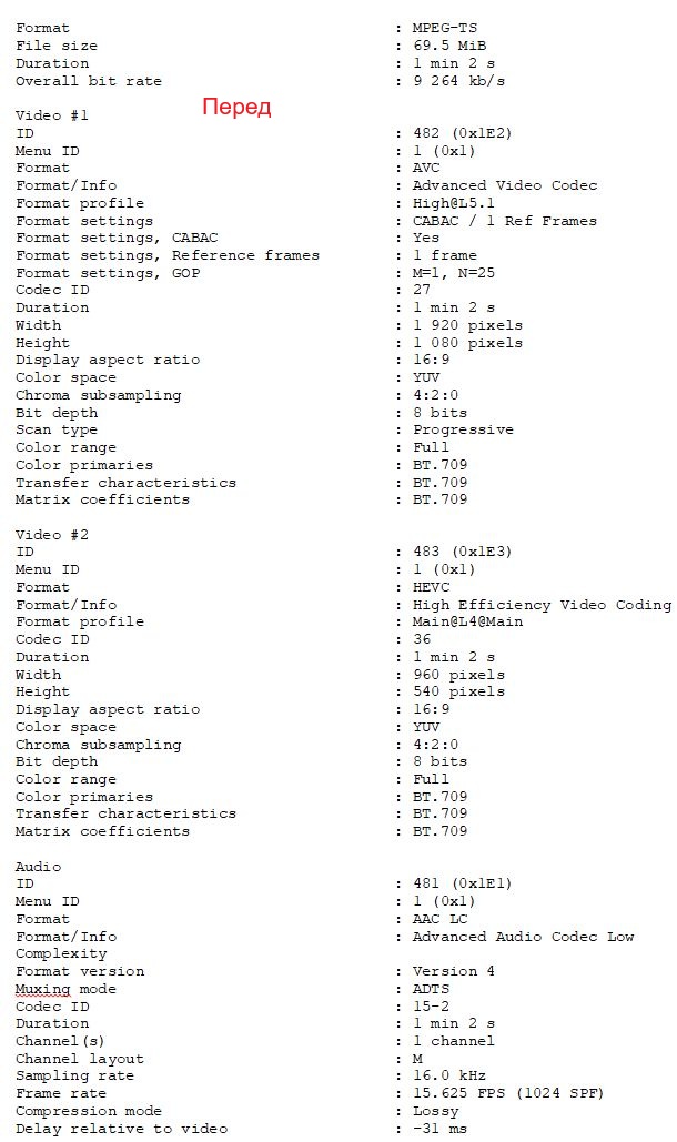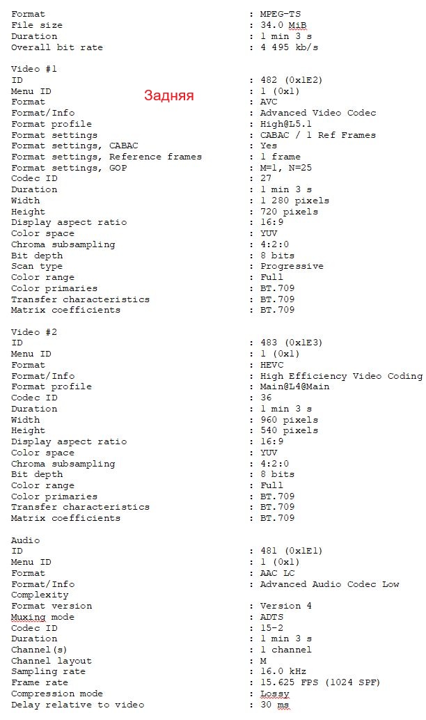 Полные параметры файлов передней и задней камеры от ПО MediaInfo версии 25.07: