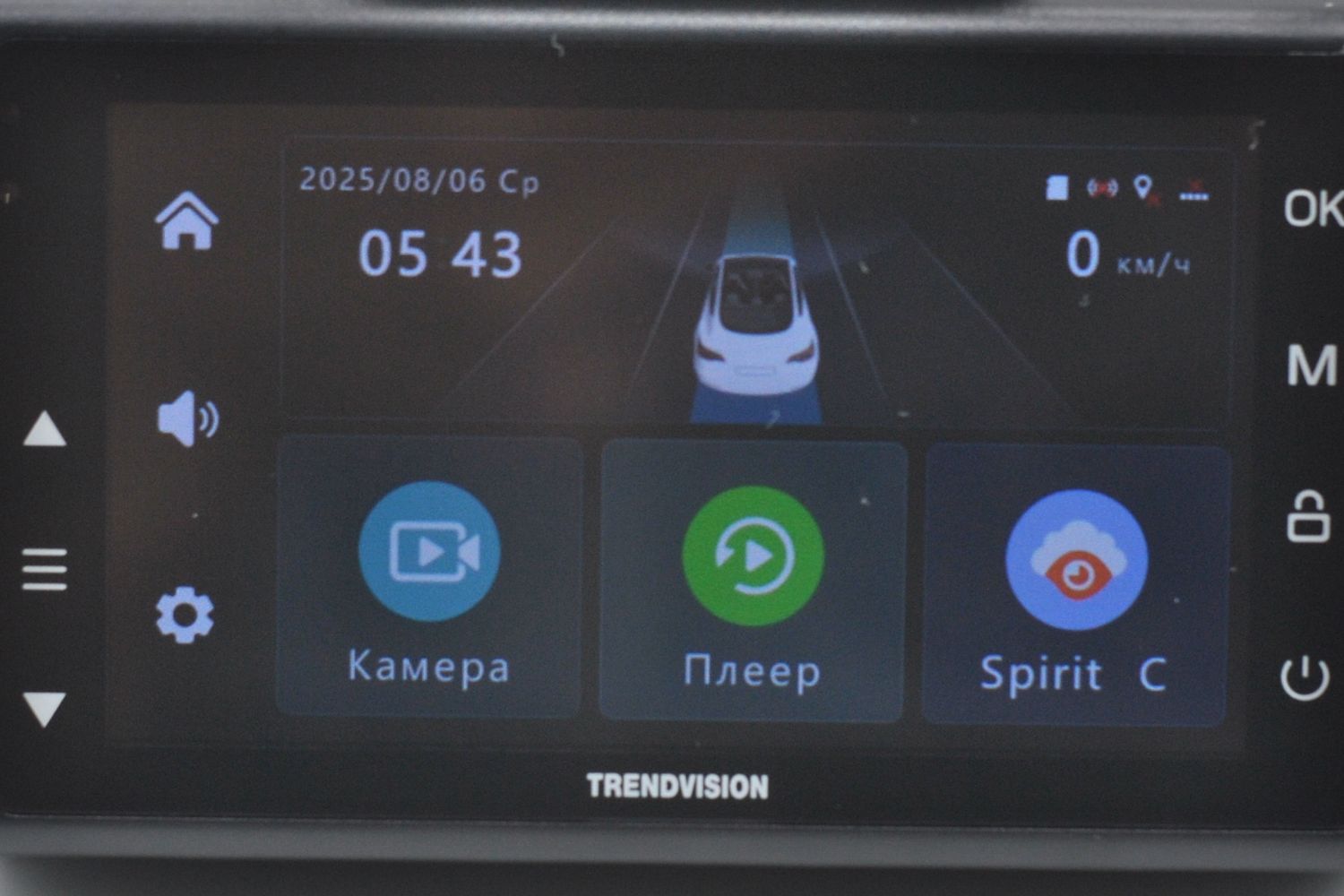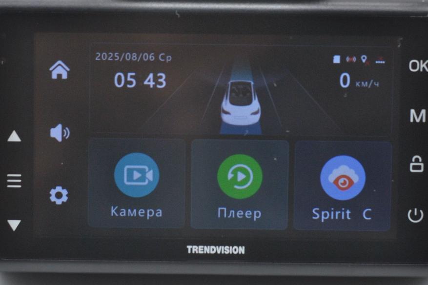 Тут выведены самые необходимые функции: камеры, просмотр, подключение к мобильному ПО, настройки и громкость оповещений. А так же видна служебная информация: дата, подключение карты памяти и сим-карты и сигнал GPS и текущая скорость.
