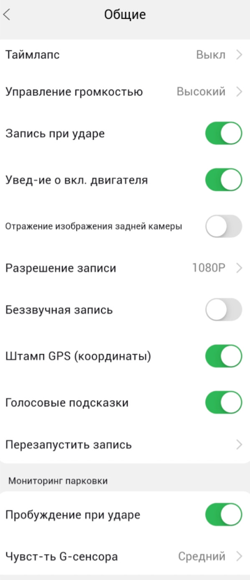 Настроек довольно много, выделим главное - разрешение 2K интерполяция, заднюю камеру можно отзеркалить, парковочный режим (таймлапс или защищенная запись по датчику удара), активация Wi-Fi точки доступа для салона от симки с мобильным интернетом, коррекция штампа скорости, нет, разве что, режима WDR.