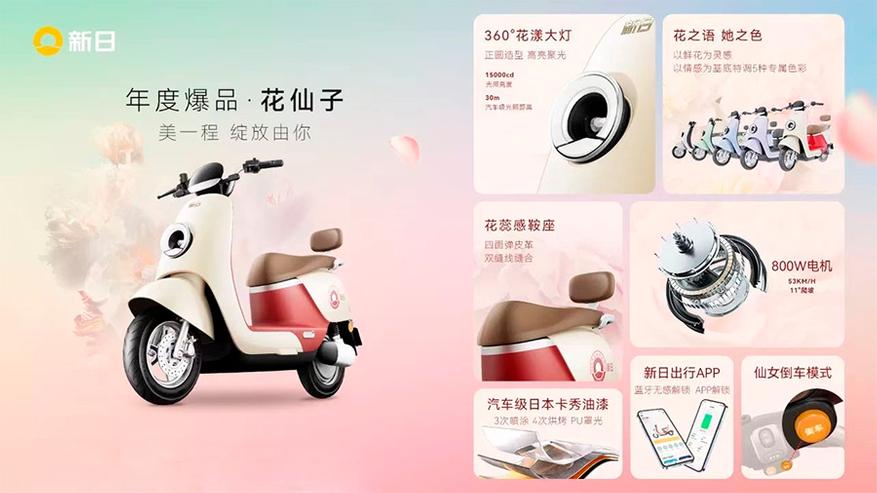 Специально для этой аудитории разработан новый электрический скутер «Цветочная фея», который оснащен двигателем мощностью 800 Вт и встроенной батареей 60V26A. Он может развить максимальную скорость 53 км/ч и преодолеть подъем на повседневных дорогах с углом подъёма 11°. Передняя часть «Цветочной феи» оснащена круглой фарой, которая имеет дальность света до 30 метров и имеет яркость света 15 000 кд.