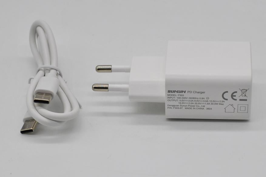 Блок питания (один разъем Type-C) для зарядки выдает 33 Вт по протоколу PD с комплектным кабелем: